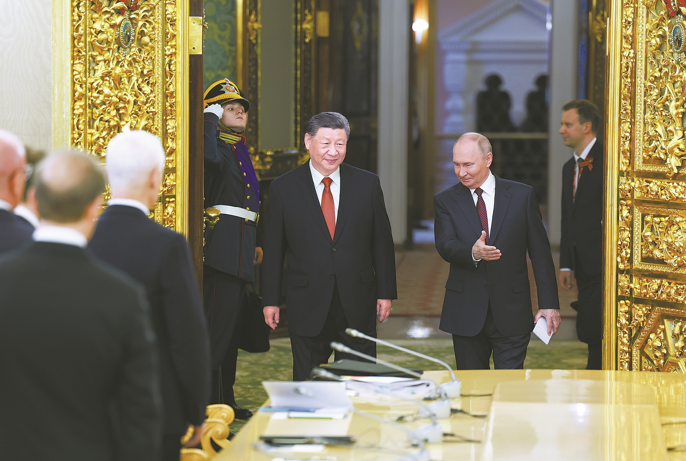 当地时间5月8日上午,俄罗斯总统普京同中国国家主席习近平在莫斯科克里姆林宫举行会谈。这是两国元首步入会场。(新华社发)