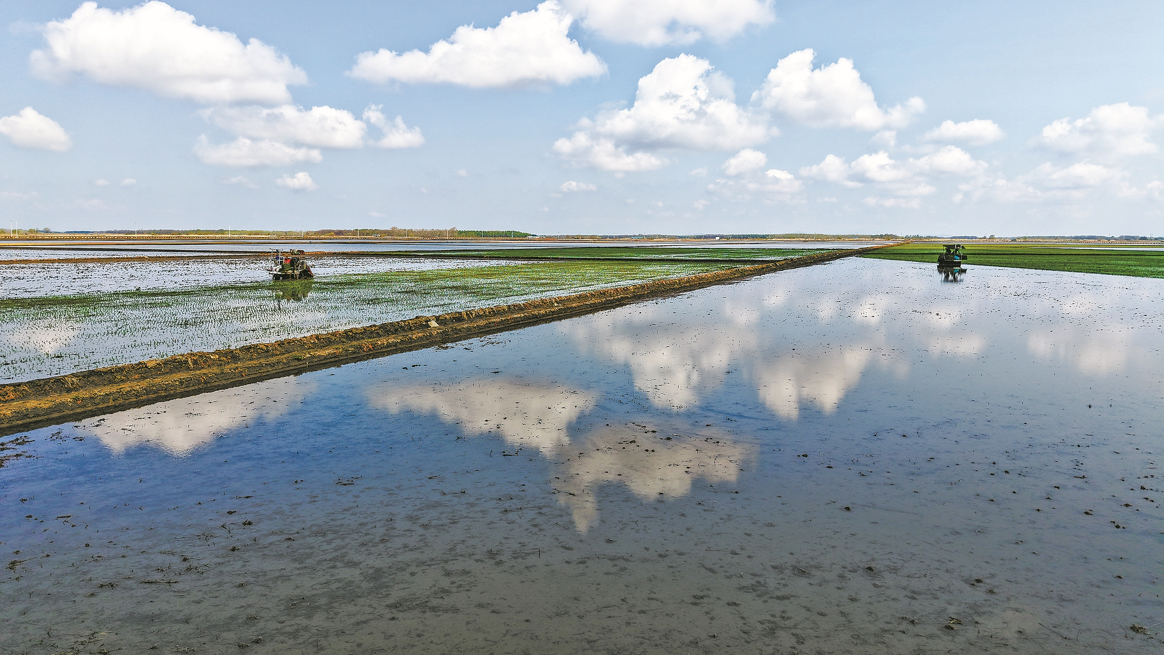 时下,黑龙江垦区春播生产全面展开。北大荒集团各农业生产单位抢抓农时,全面推进水田、旱田播种作业,水稻插秧陆续展开,旱田作物播种也由玉米向大豆逐渐转段,“水陆并进”的春耕大戏正在黑土地上上演。(新华社发)