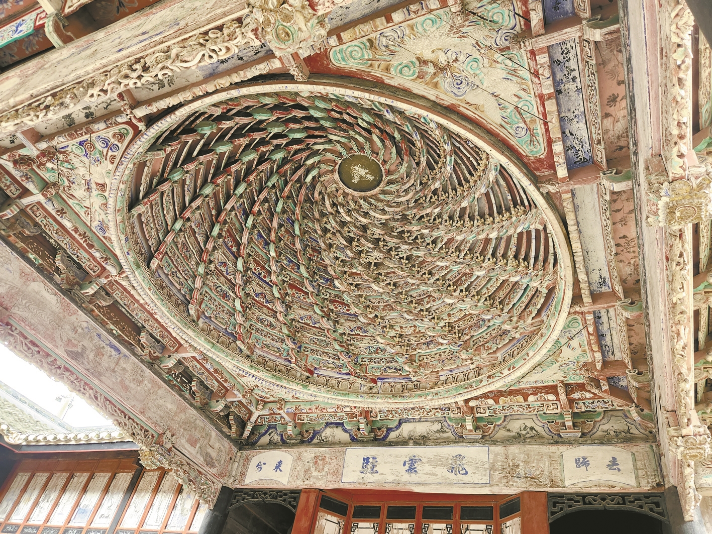 戏台顶部设有密集型的小斗拱,螺旋上升,下宽上窄,直收到顶,形成藻井。因其形似民间编织的鸡笼,人们形象地称其为“鸡笼顶”。可别小看这一制式,古代没有扩音设备,而“鸡笼顶”具有吸音和共鸣的作用,能聚集声音,拢而不散,达到拢音的效果。世人常言戏曲的“余音绕梁”,多是这“鸡笼顶”在起作用。
