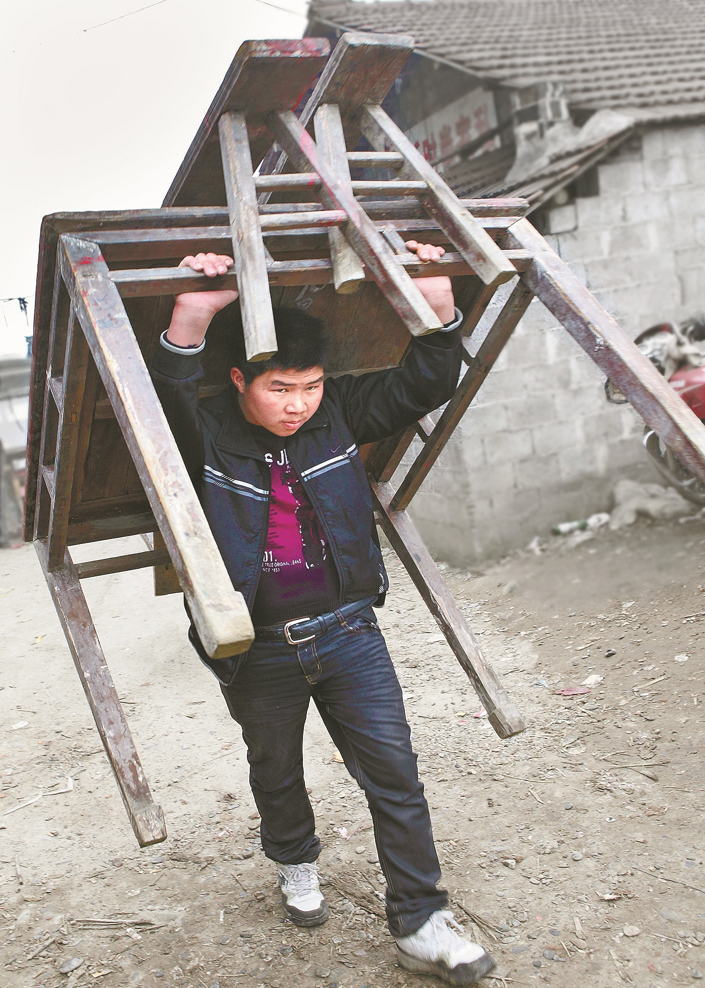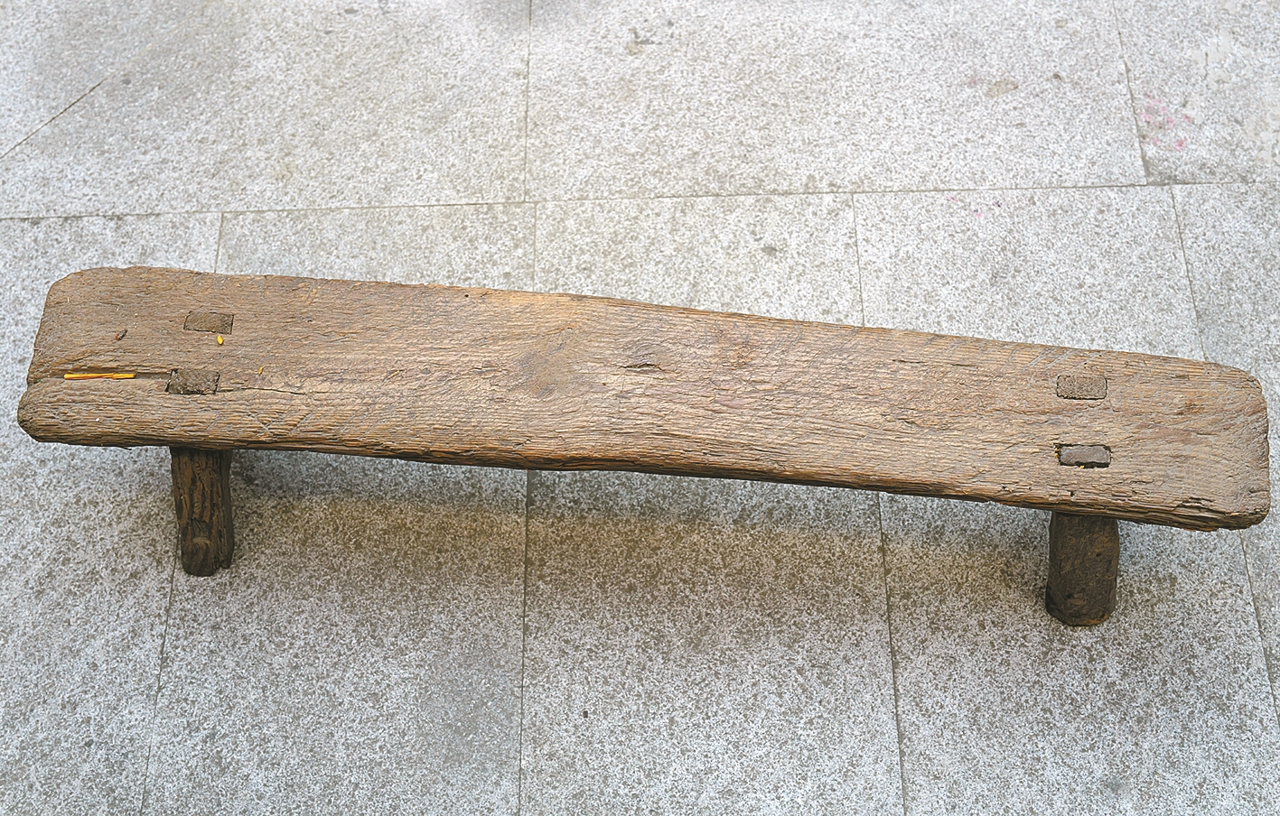木凳,全国各地都有,而且种类丰富。从体积上说有大小之分:有能坐十来人的大木凳,一般用于公众场合;有能坐二三人的寻常木凳,它在普通家庭中的占有率最高;还有只能一人坐的小凳,宁波人俗称其“小矮凳”。从功用上说有蛮雅之分:“蛮凳”粗蛮、结实,且“伤痕累累”,它其实就是家庭的工作台面,斩竹劈木、搭脚手架、干泥工活都得用到它;而与八仙桌相配的,就称得上是“雅凳”了,这类木凳漆着喜庆的红色,凳面上还描着花。多年前,我在江西安义古村拍到过与圆桌特配的弧形长凳,它们与圆桌组成了同心圆,传达了美好的寓意。
