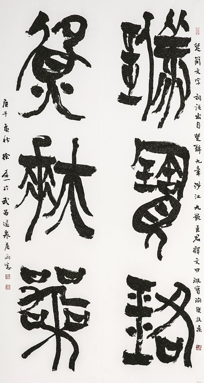 展览的“江水沛兮”主题板块,则聚焦徐本一2023年前后对大字书法与楚简书的探索与创新。他大胆地将碑学的雄浑厚重与帖学的秀逸灵动相融合,在传统书法的根基上,开拓出属于自己的个性化艺术语言。那一幅幅气势磅礴的大字作品,犹如汹涌澎湃的江水,展现出生命的激情与活力;而题写天一阁水北阁的楹联“水影入廊,方触动百年情愫”,则又流露出他对文化根源的深深眷恋和深切回望。这种在传统与创新之间的巧妙平衡,不仅展现了徐本一先生深厚的书法功底和卓越的艺术创造力,也为当代书法的发展提供了宝贵的借鉴与启示。