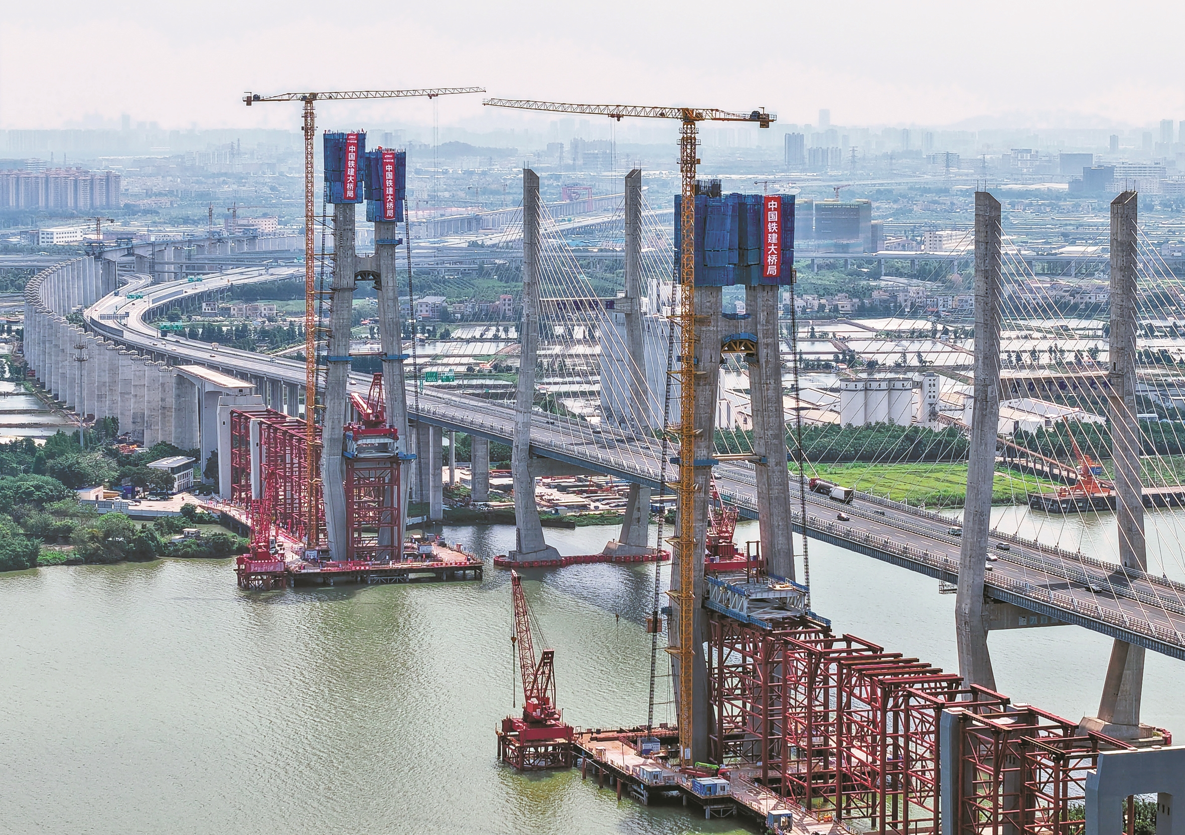 5月11日,深江铁路跨磨刀门水道主桥东主塔(左一)封顶(无人机照片)。该桥横跨中山和江门两市交界的西江磨刀门水道,为140米高墩大跨斜拉桥。该工程建成后,深圳与江门可实现1小时内通达。(新华社发)
