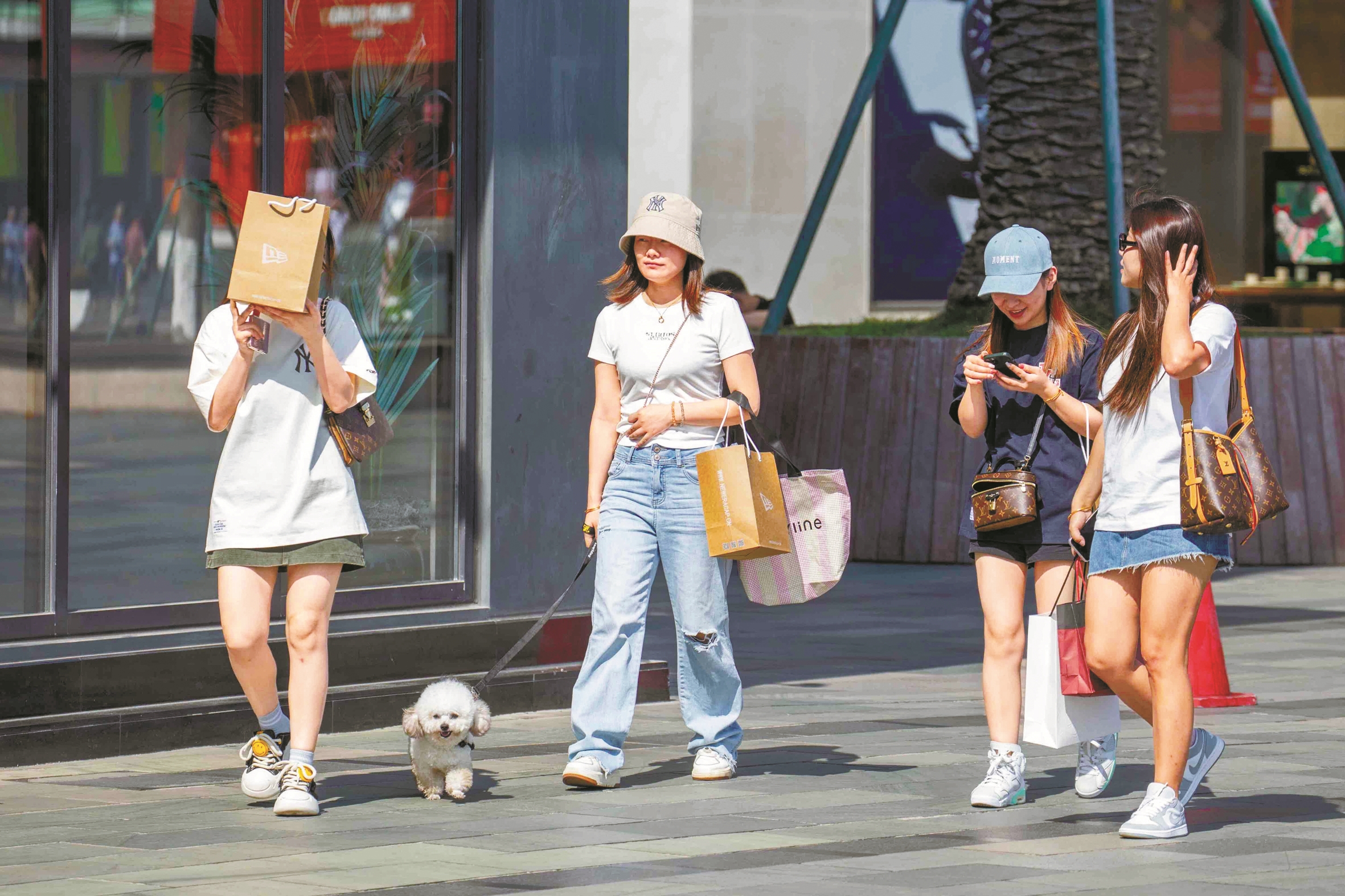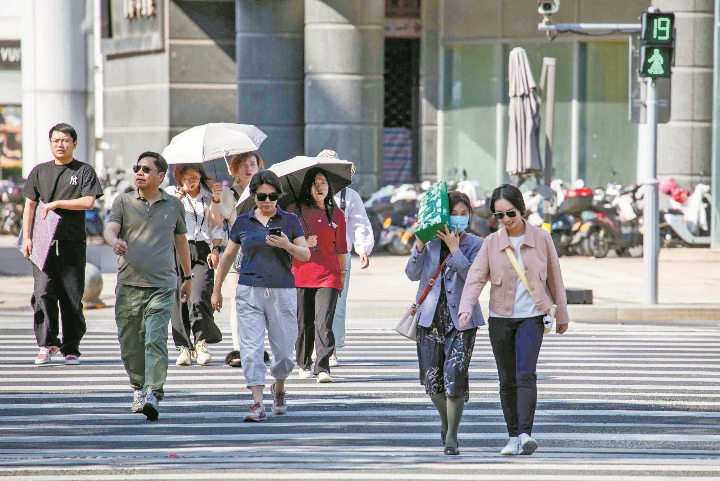 昨日,宁波进入夏季。当天中午阳光灿烂,气温急速上升,在甬城的大街小巷,许多出行的市民换上清凉夏装,有的用上遮阳伞帽,城市洋溢着浓浓的初夏氛围。(徐能 张昊桦 朱宪春 摄)