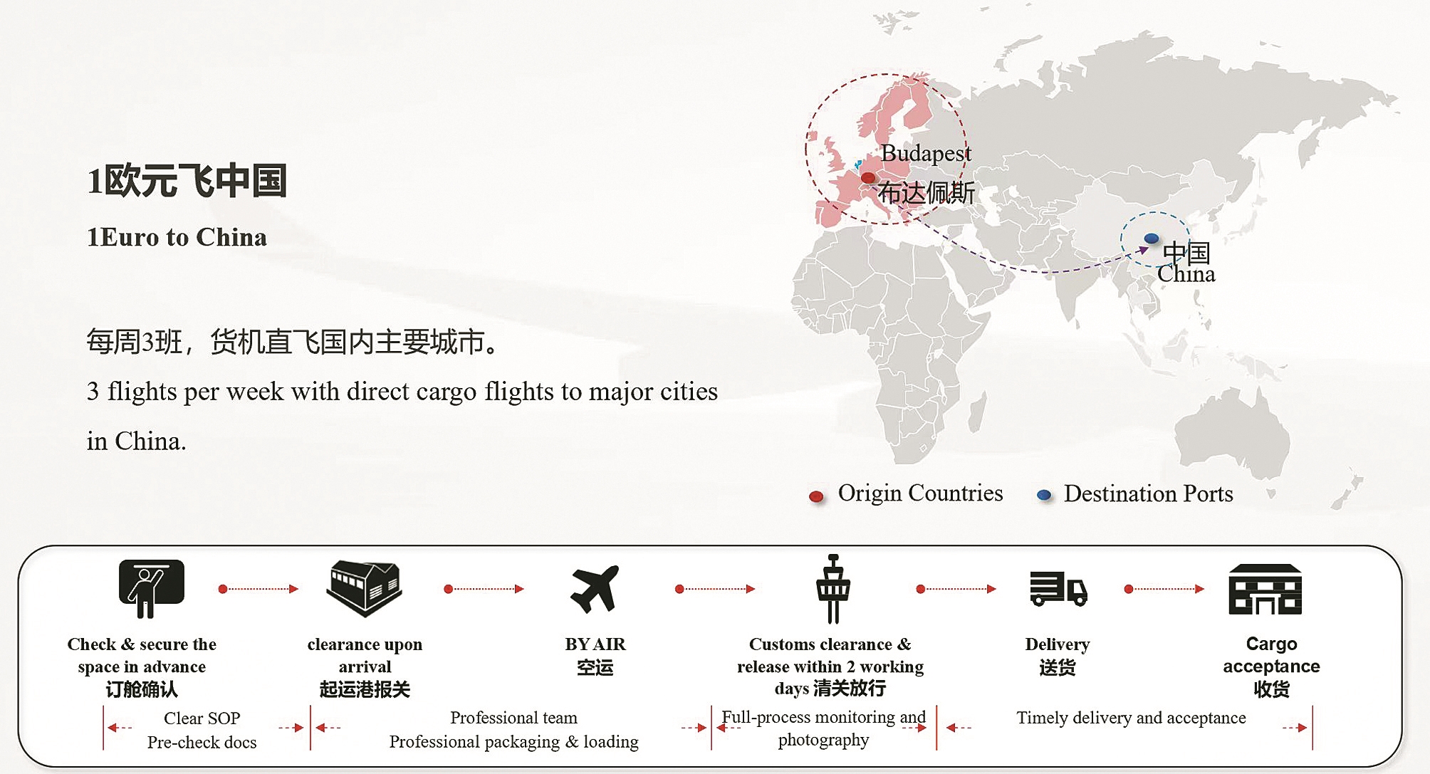 据了解,该洲际快递每周三班直航,高附加值的中东欧商品经订舱确认、起运港报关、空运入境后,第3天清关放行、第4天即可送货上门。
