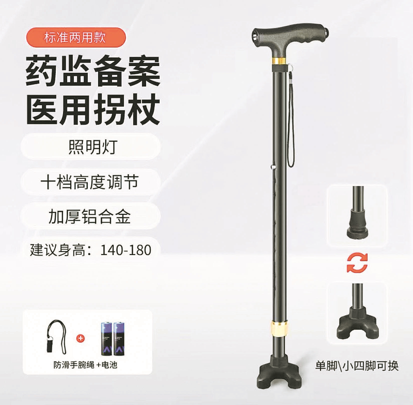 该款拐杖为铝合金材质,整根自重不到500克,方便外出携带,且可用卡扣调节高度(共十档),老人可根据自身身高及使用习惯自由调节。值得一提的是,拐杖上端还有照明灯,为夜间出行带来便利。