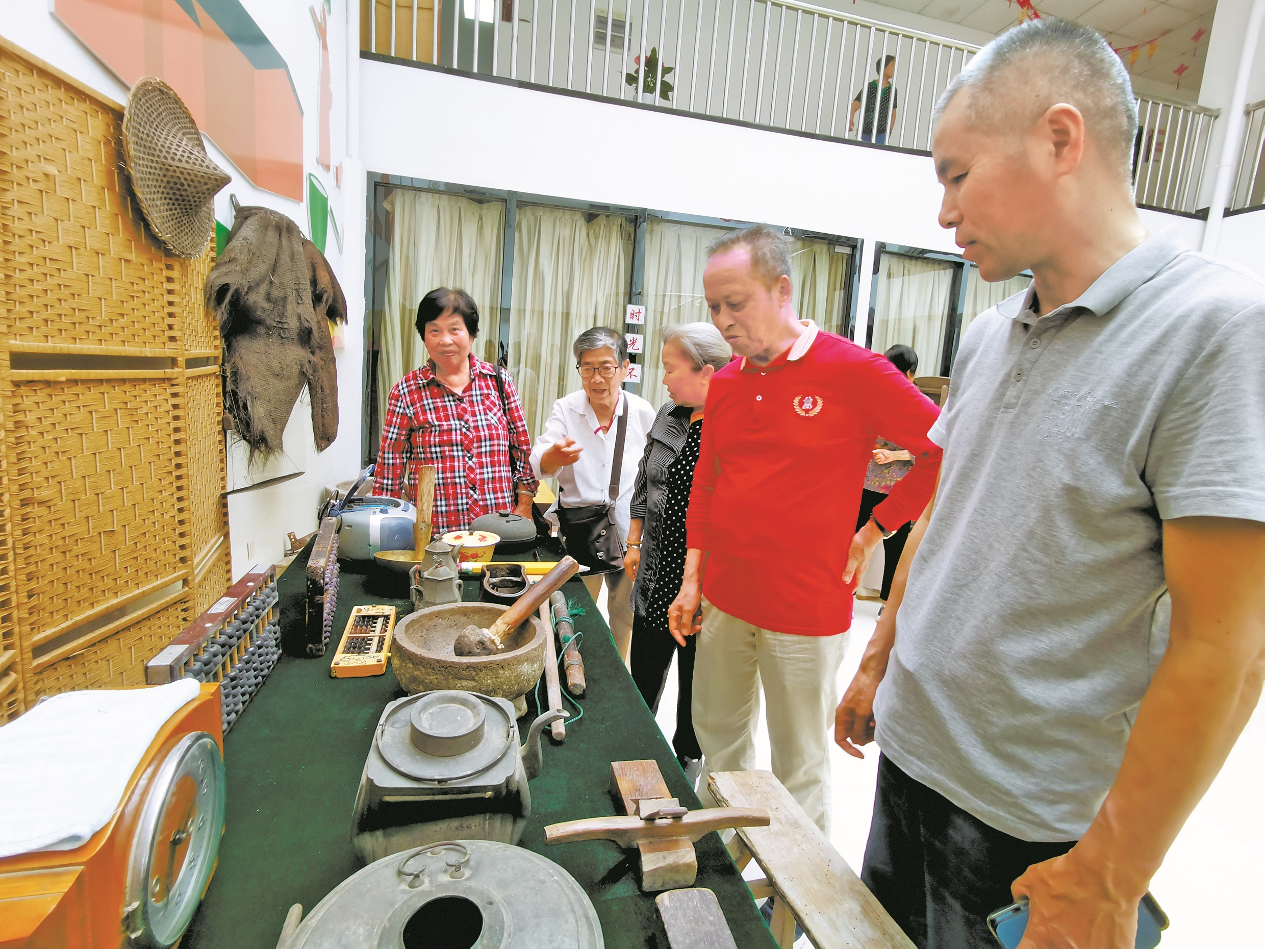 “这个烧水壶,我家也有一个。”“这个像鱼一样的玻璃制品,是孩子的奶瓶。”“这个是稻谷脱粒机,现在很难看到了”……居民一边看展,一边交流,勾起满满的回忆。