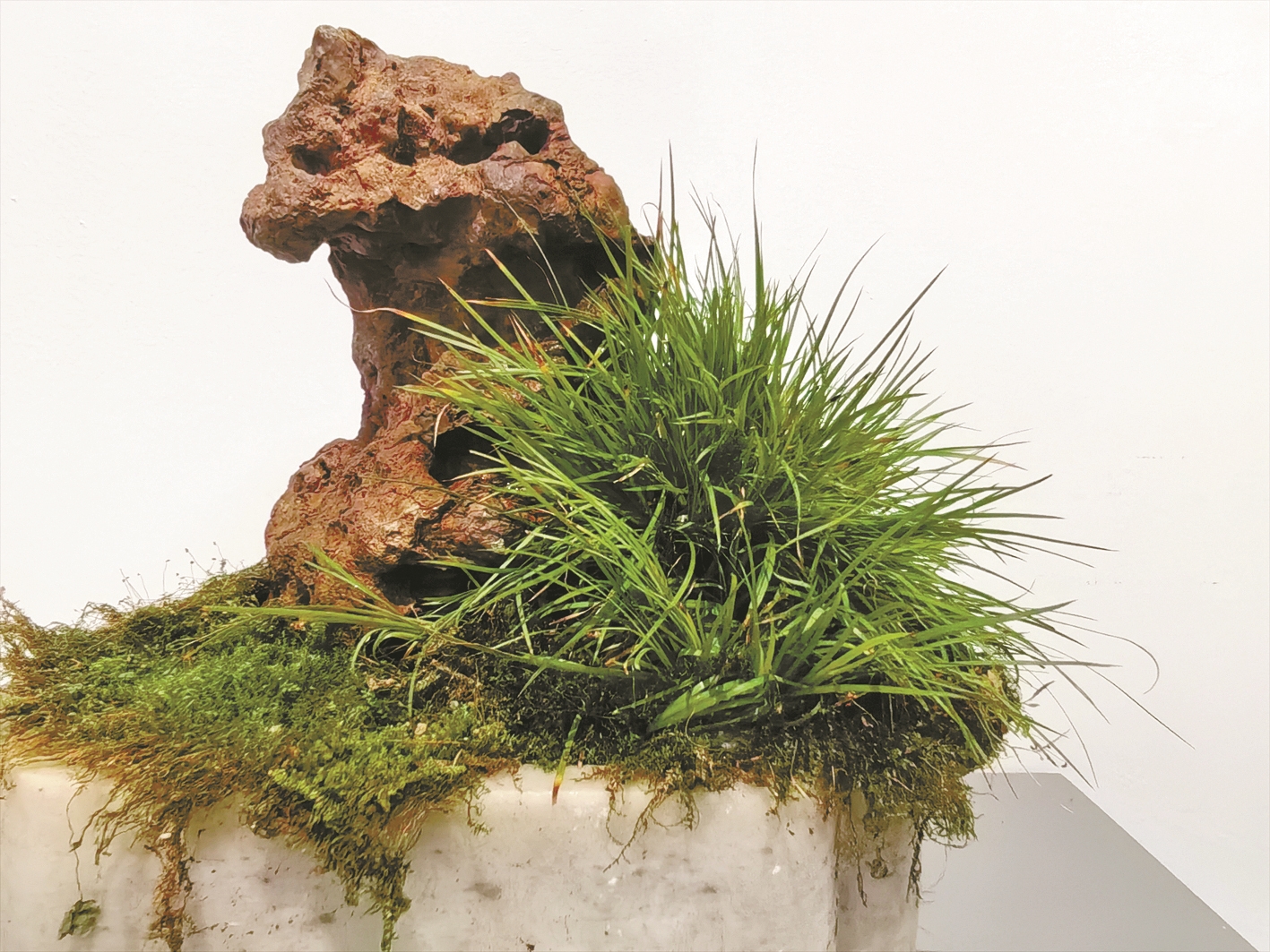“看这龙根,比钢筋还要坚韧。”展览现场,吴宇鸿用指节轻叩展品《九节长青》的根部。这盆栽种在汉代画像砖残件上的菖蒲,根系已与砖纹中的车马出行图浑然一体。叶尖垂落的露珠,映照着展厅内川流不息的参观者,仿佛在诉说千年的故事。