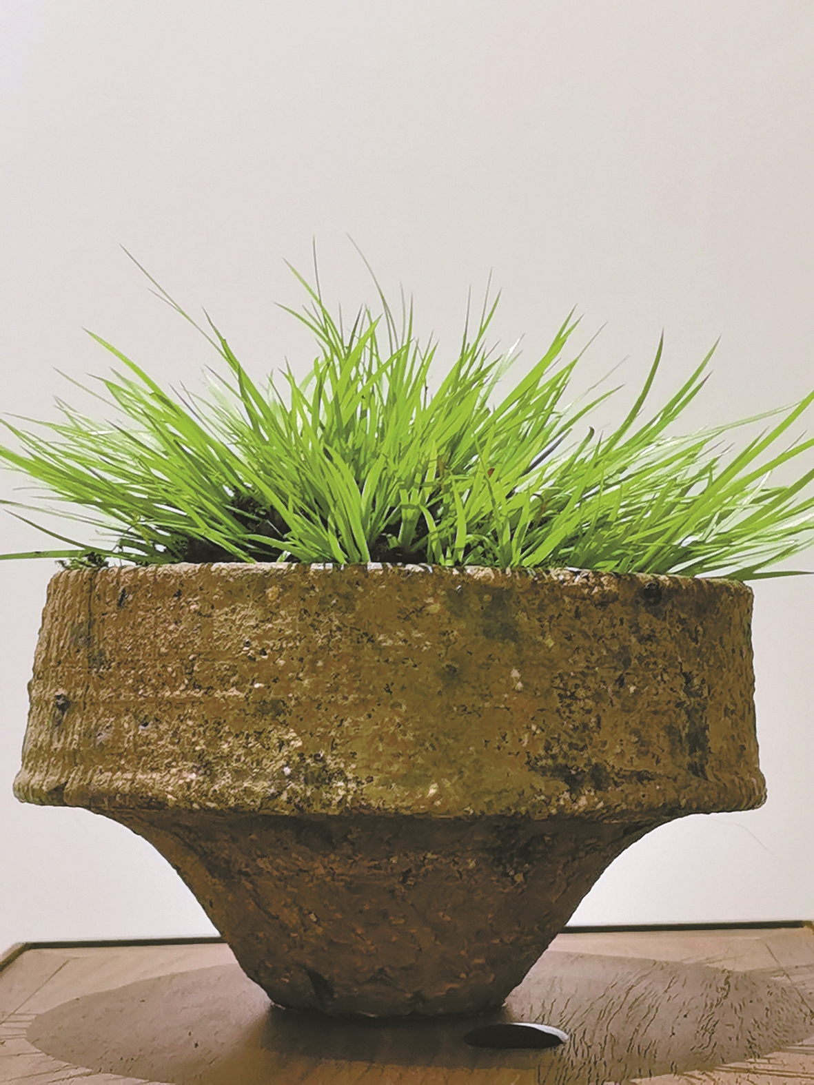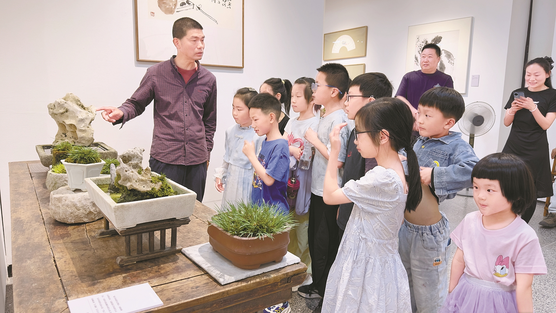 展览中,一件北宋景德镇窑口青釉闸钵格外引人注目。钵中菖蒲根系如龙须缠绕火山岩,岩缝间还残留着古代窑工不经意洒落的瓷土。“草木赋予金石生命,金石赋予草木力量。”这盆菖蒲的主人陈龙轻抚钵体古朴的纹路。窗外天光和煦,钵中水光潋滟,令人恍若穿越时空。