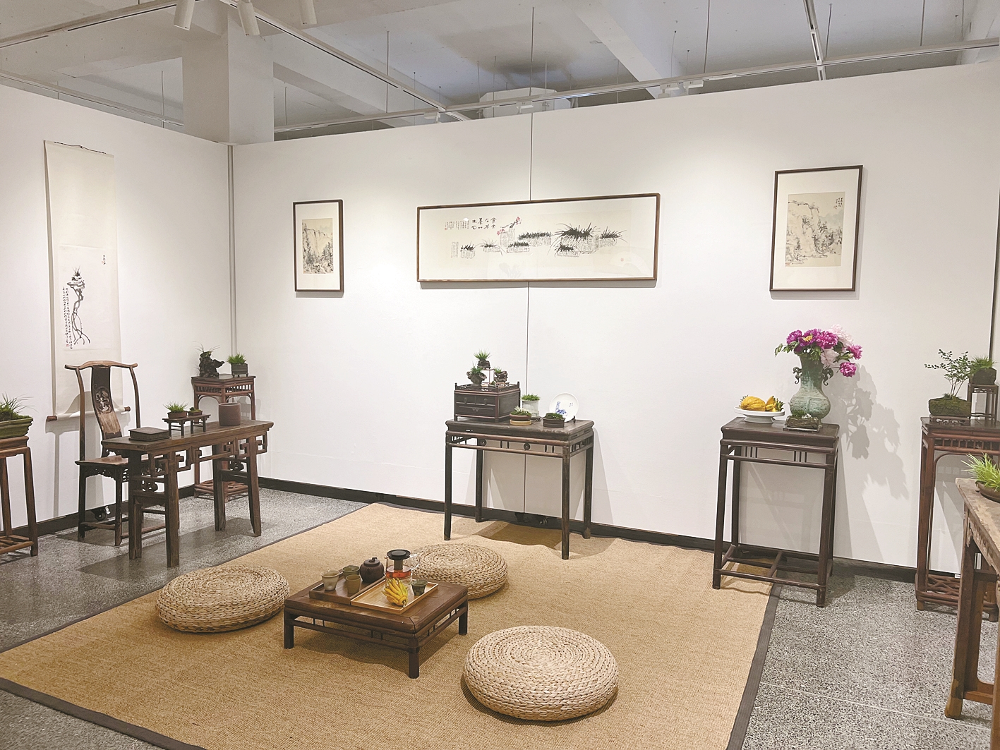 菖蒲与书画、家具、装置艺术交相辉映。展览现场,宁海藏家“漏室”还原古代文人书房场景,展出的画作大多为其近年来所创,内容紧扣菖蒲文化,围绕清供主题,搭配佛手、芙蓉、铭文砖等传统意象,呈现出古朴典雅的文人趣味。
