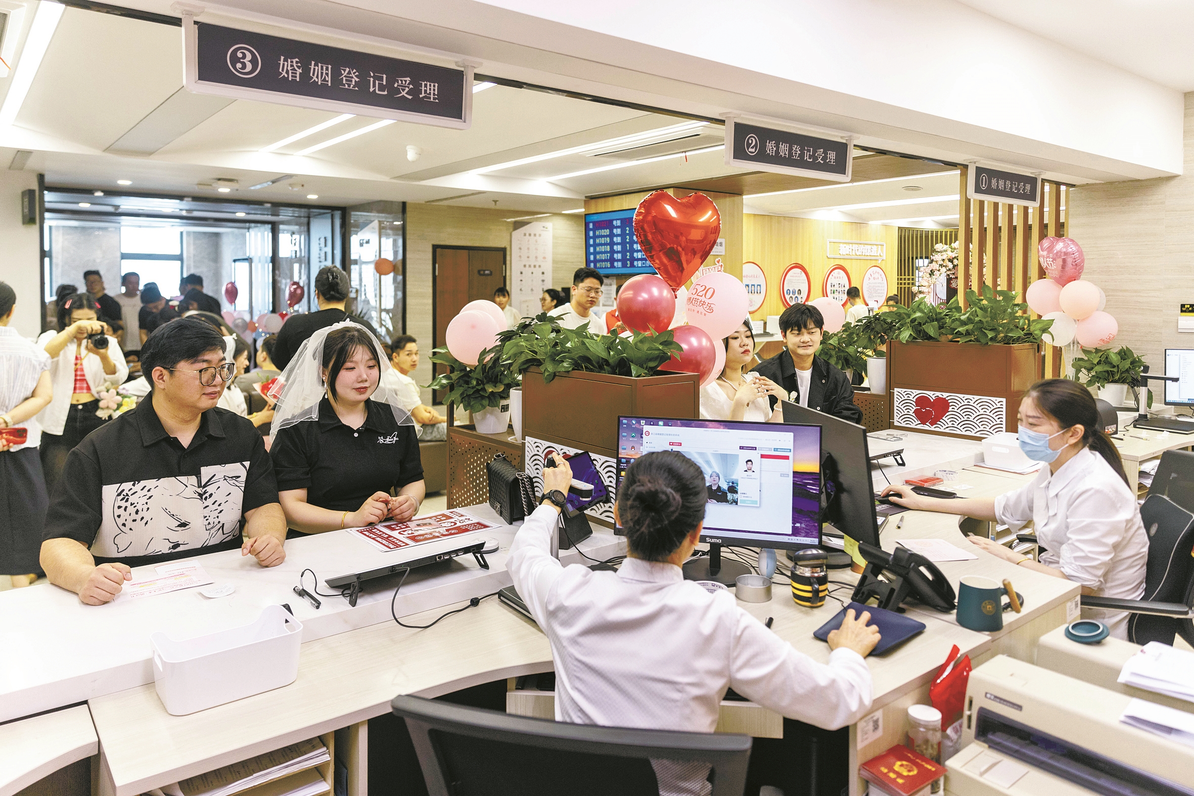 昨日,宁波各婚姻登记服务中心处处可见幸福笑脸,众多新人选择在这个日子登记结婚。 (王佳 李越 摄)