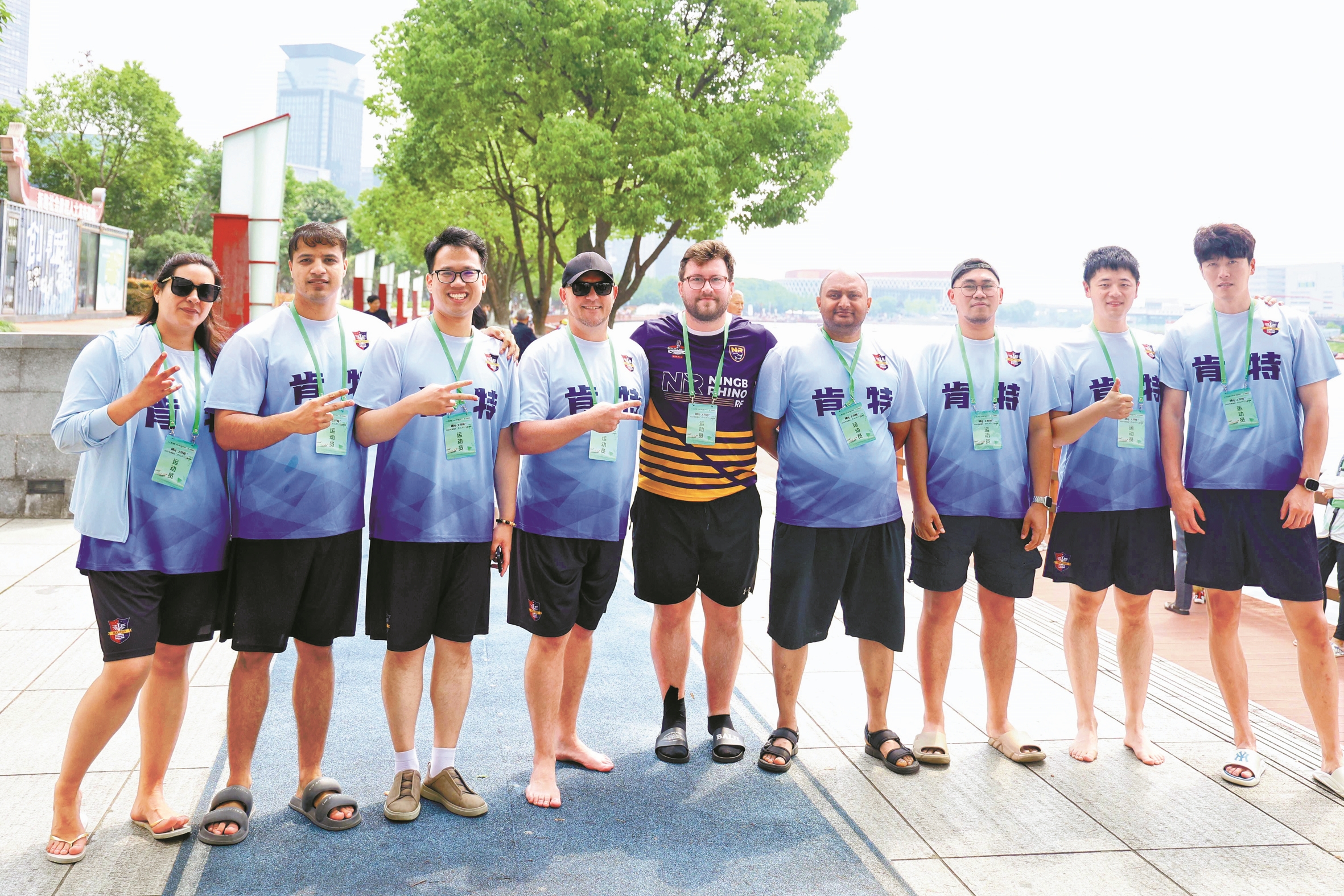 “One!Two!Three……”前日下午,镇海市民广场旁的箭港湖上,英文号子声伴随着震天鼓点划过湖面,宁波赫威斯肯特学校龙舟队的10名中外教师,正在2025年“同心同行”龙舟赛预赛上,进行最后的冲刺。