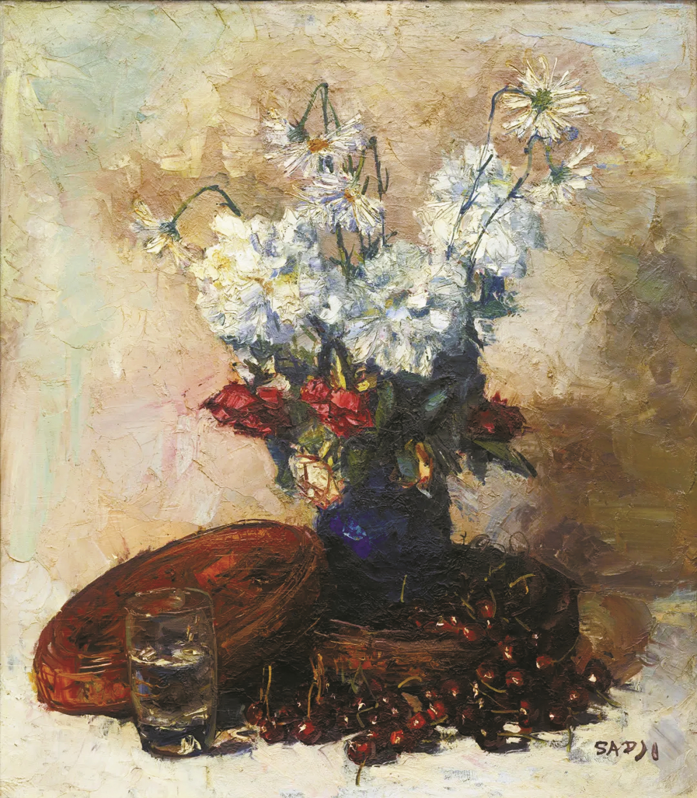 这幅创作于沙耆比利时留学时期的作品,以蓝瓶白花为主体,配以樱桃与水杯,冷暖色调交相辉映,既展现了学院派的扎实功底,又融入了印象派的光影表现手法,被艺术界公认为其早期代表作品。