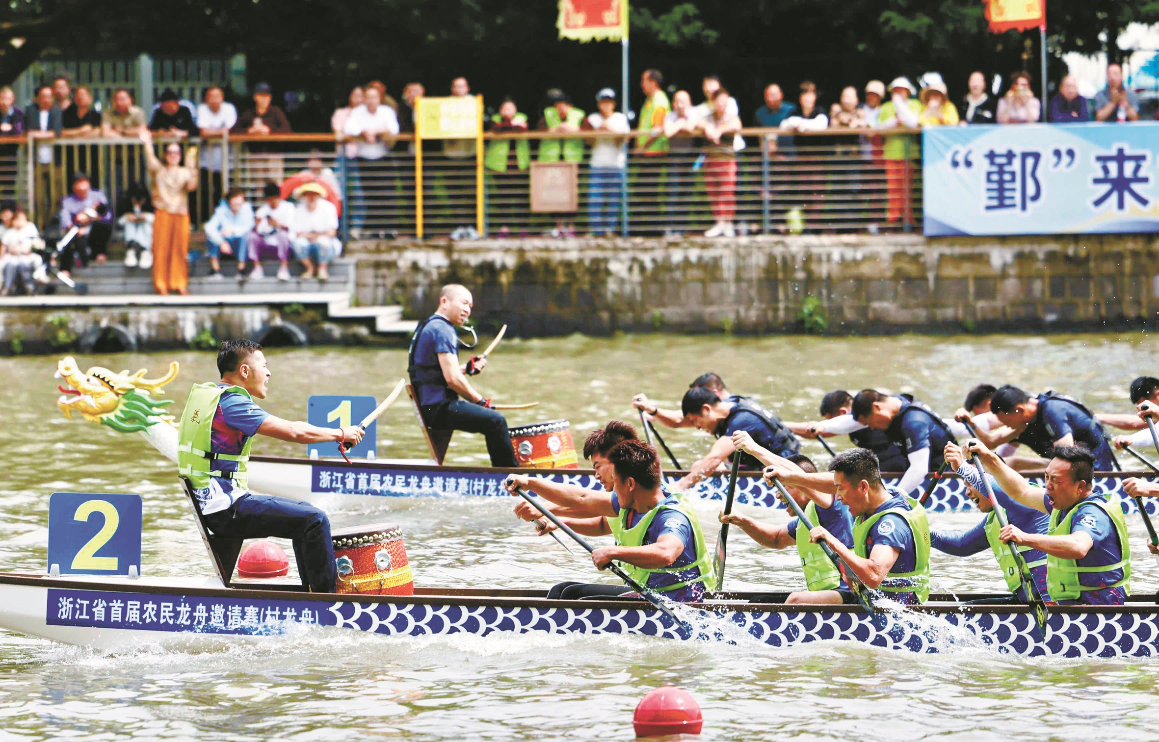 “加油!加油!”……鼓点与呐喊声交织,楫桨翻飞击浪。昨日上午,浙江省首届农民龙舟邀请赛在鄞州区云龙镇沿山干河火热开赛,12支龙舟队伍劈开碧波奋勇争先,将端午民俗的热烈氛围推向顶点。