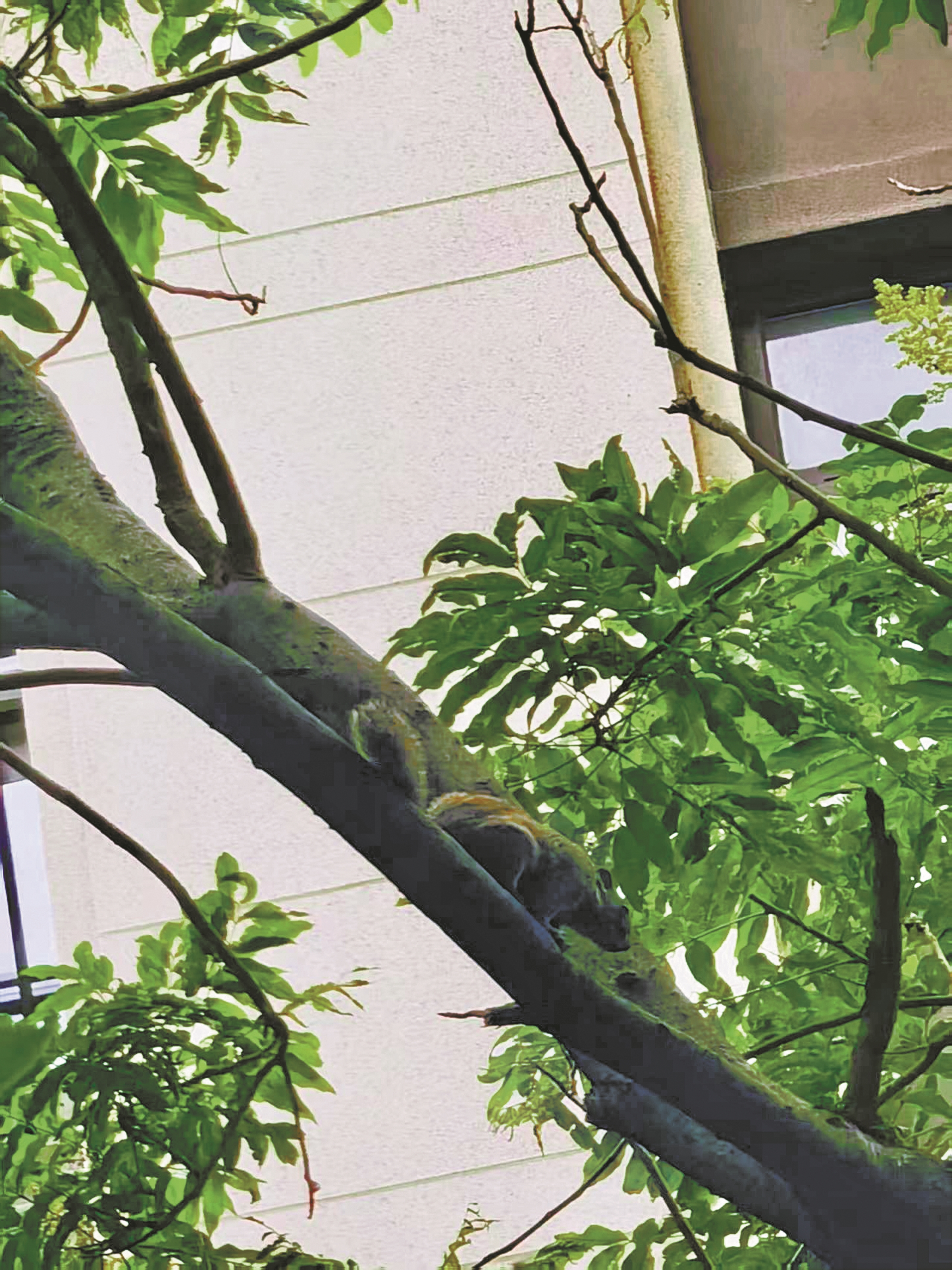 记者随后联系上王女士。她回忆说,5月下旬一天,她与孩子在小区里散步,突然听到头顶传来窸窸窣窣的声响。抬头一看,一只毛茸茸的大松鼠正在树枝间灵活跳跃。
