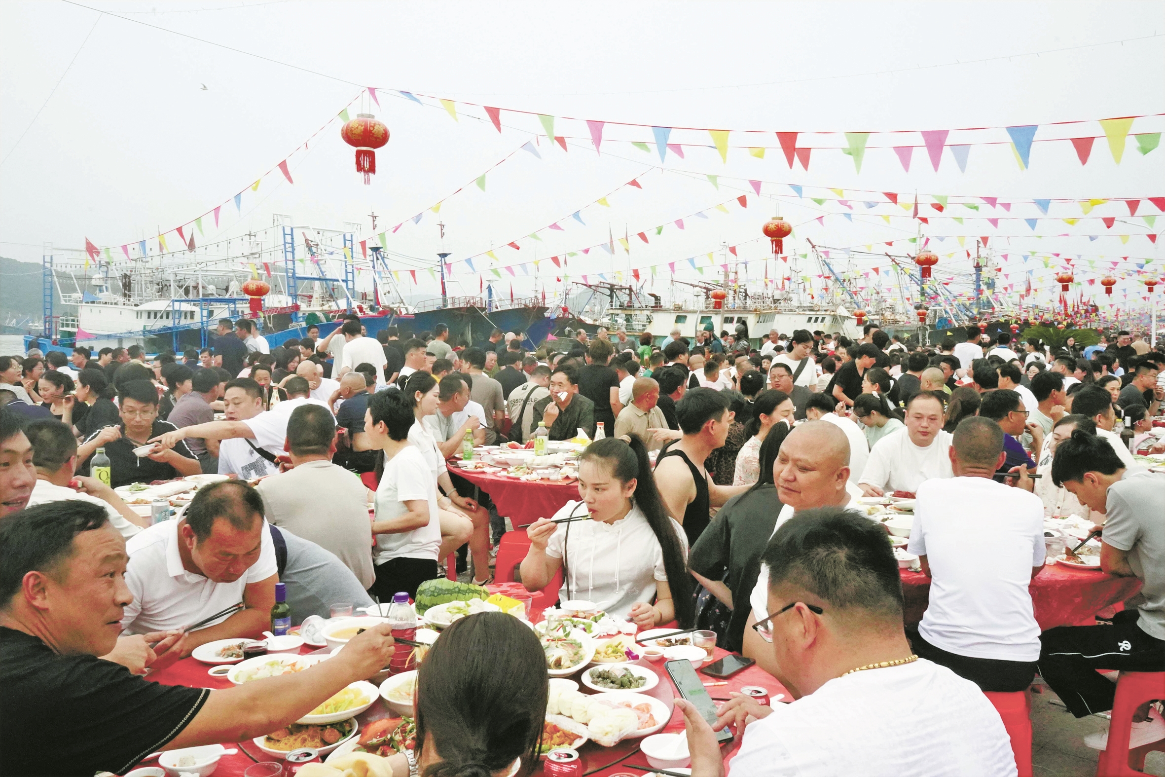 在活动现场,葱油青蟹、风干带鱼、石浦肉丸和鱼滋面等渔家美味陆续被端上桌。满脸笑容的渔嫂在食客间穿梭,将一盘盘美食呈上。村主干道两边,871桌宴席排开,绵延500余米。村民与游客欢聚一堂,在杯盏交错中共品渔家盛宴。