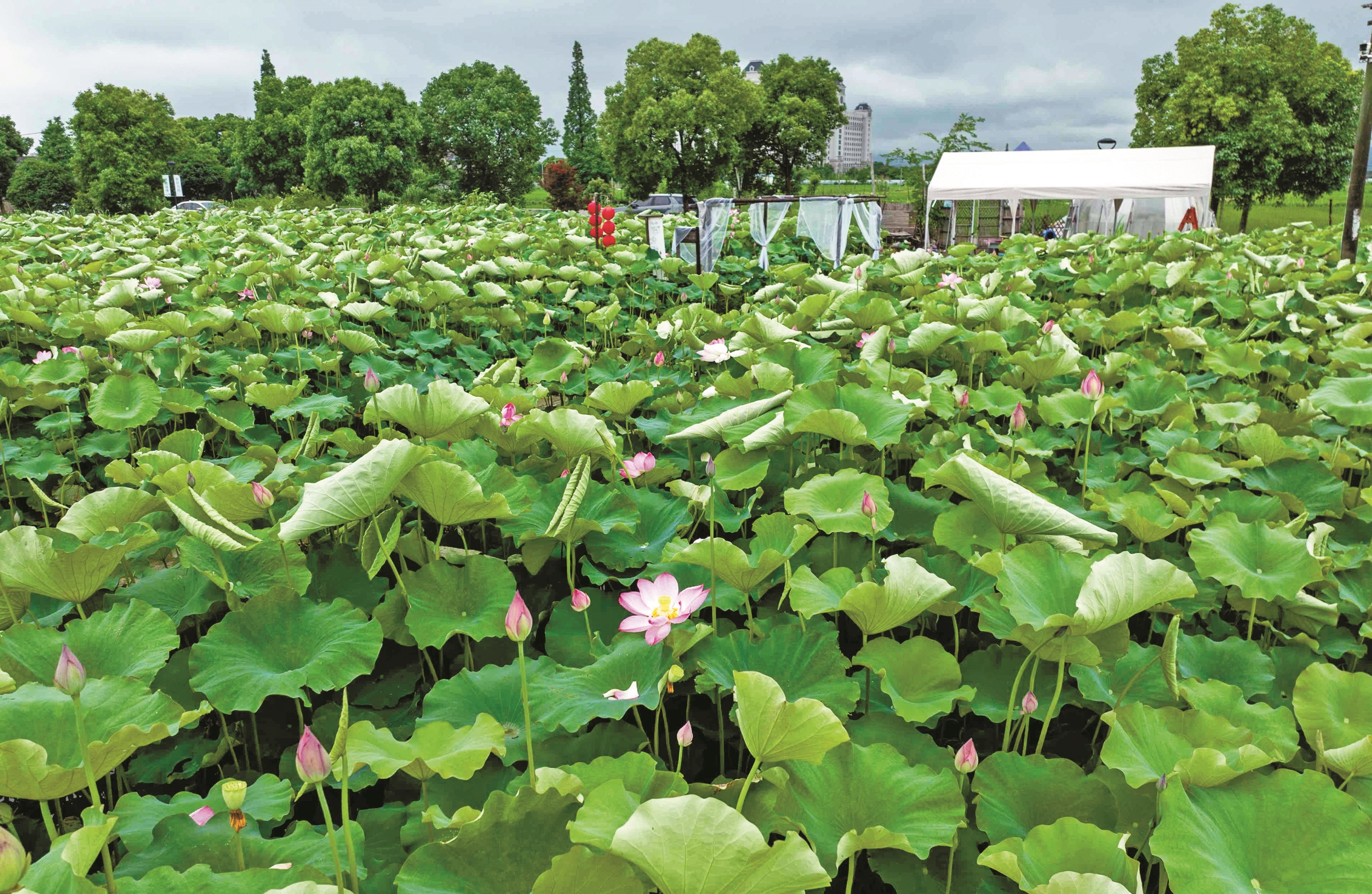昨日的海曙区集士港镇新后屠桥村,蒙蒙细雨中氤氲着荷香。据介绍,村内50亩荷塘种植的荷花主要品种为太空莲,因曾搭乘航天器完成太空育种得名,花朵直径可达30厘米。目前荷花正值初绽期,预计一周后迎来全盛景观,届时“映日荷花别样红”的盛况可持续至8月中旬。