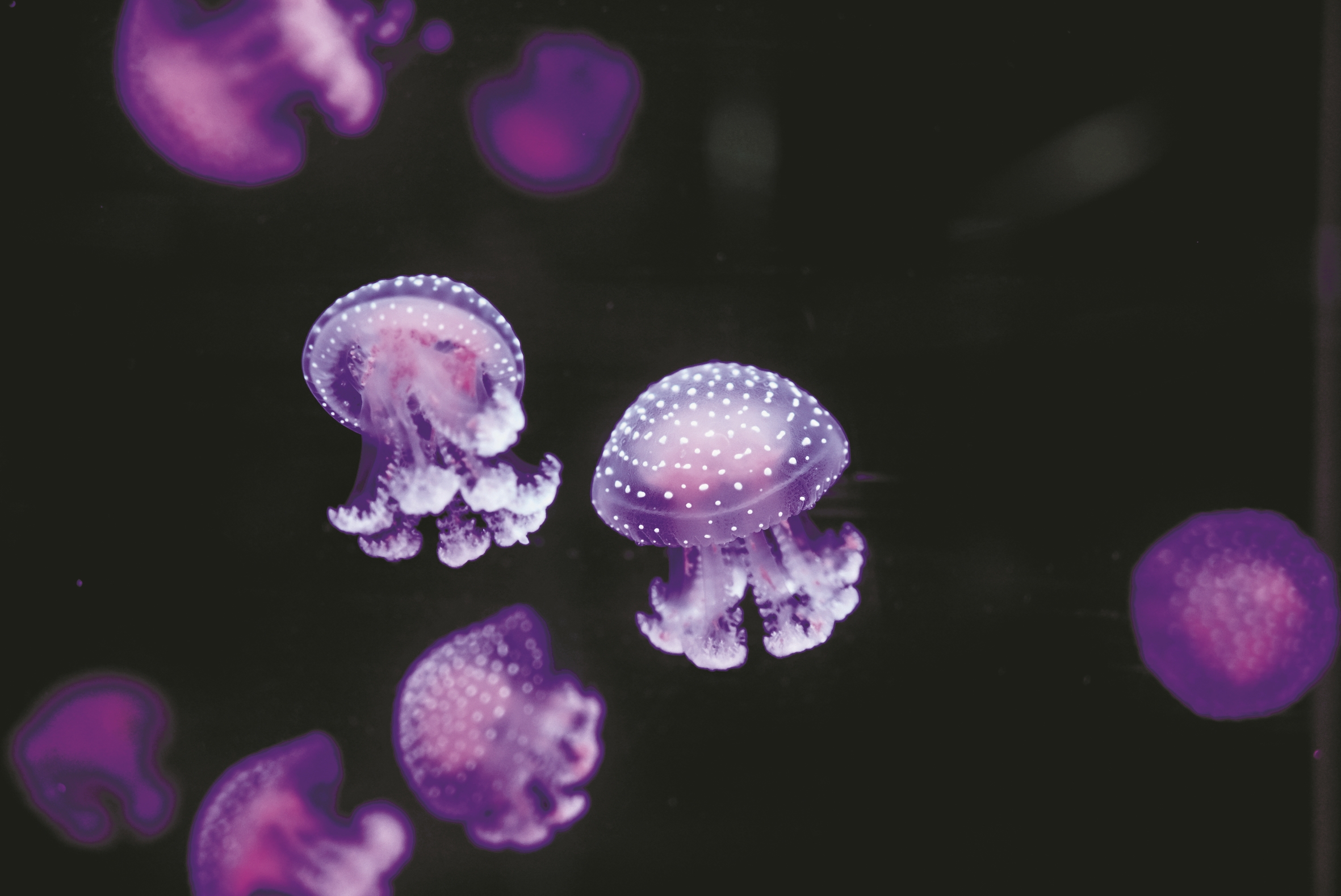值得一提的是,鱼人叶硝水母从碟状体到幼体水母时期(伞径为3厘米至5厘米),伞体边缘有一圈罕见的蓝色光环,十分独特。