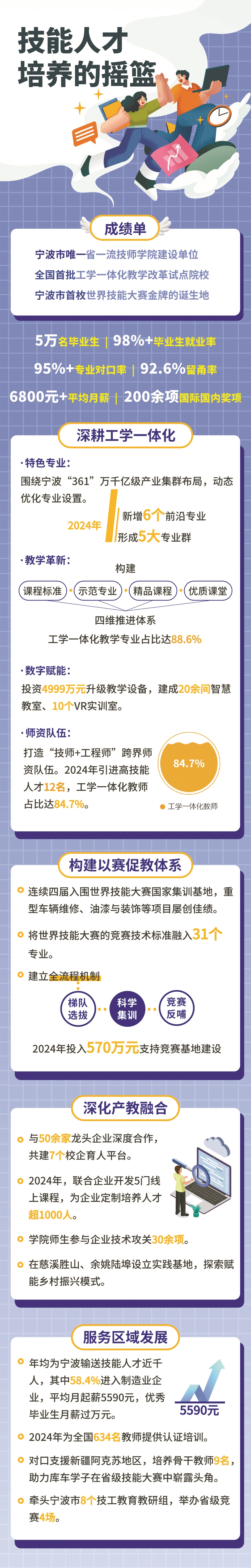 截至目前,5万名学子从这里走出,毕业生就业率常年稳居98%以上,专业对口率超95%,留甬率达92.6%,人均月薪平均超6800元,师生在技能大赛上斩获国际国内奖项200余项,为宁波打造“智创之都”输送了源源不断的高素质技能人才。