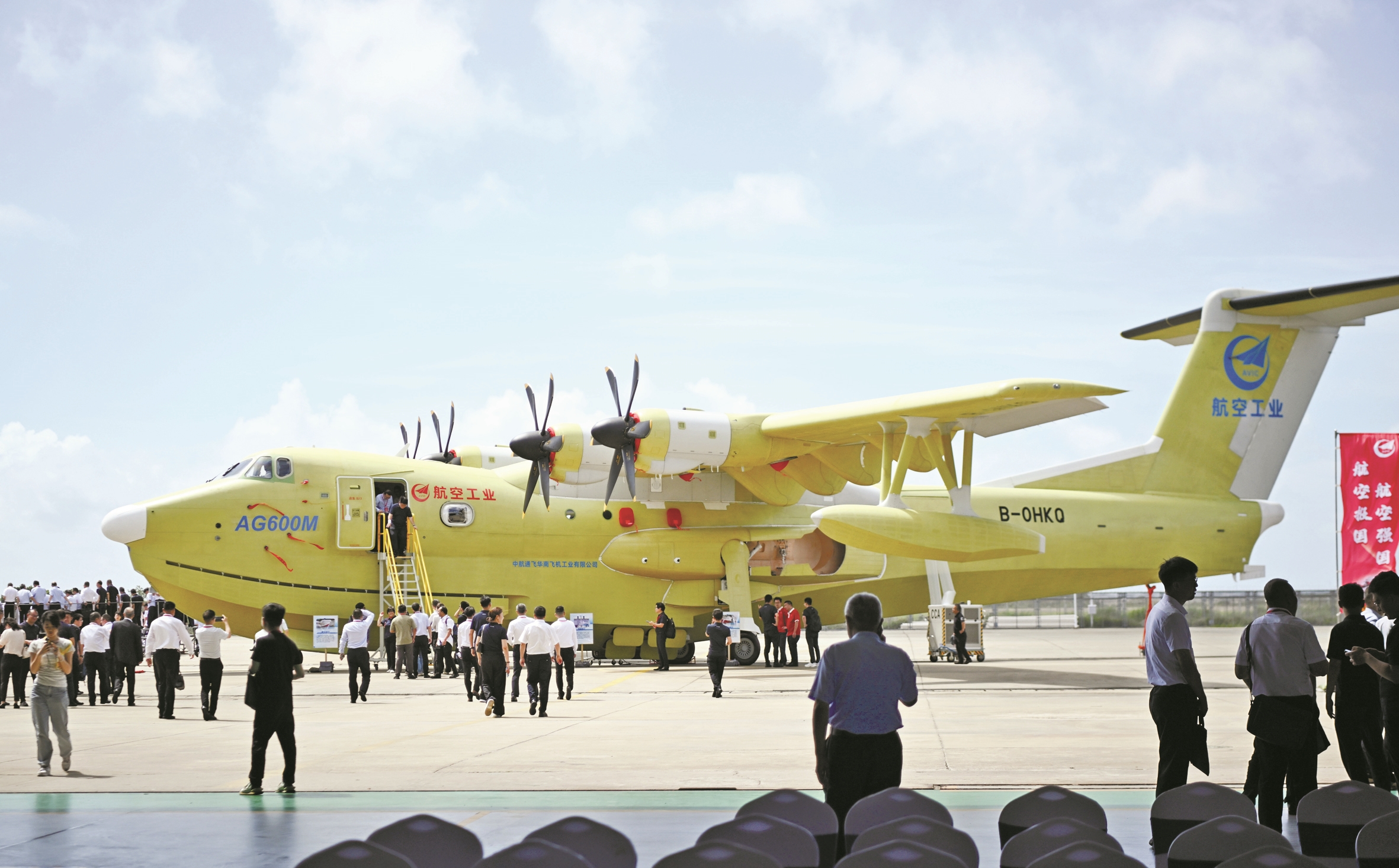 6月11日,在珠海中航通飞华南飞机工业有限公司,现场展示的批量生产的首架AG600飞机。当日,我国完全自主研制的大型水陆两栖飞机AG600“鲲龙”在广东珠海获颁中国民航局生产许可证,标志着AG600飞机正式迈入批量生产阶段。(新华社记者 邓华 摄)