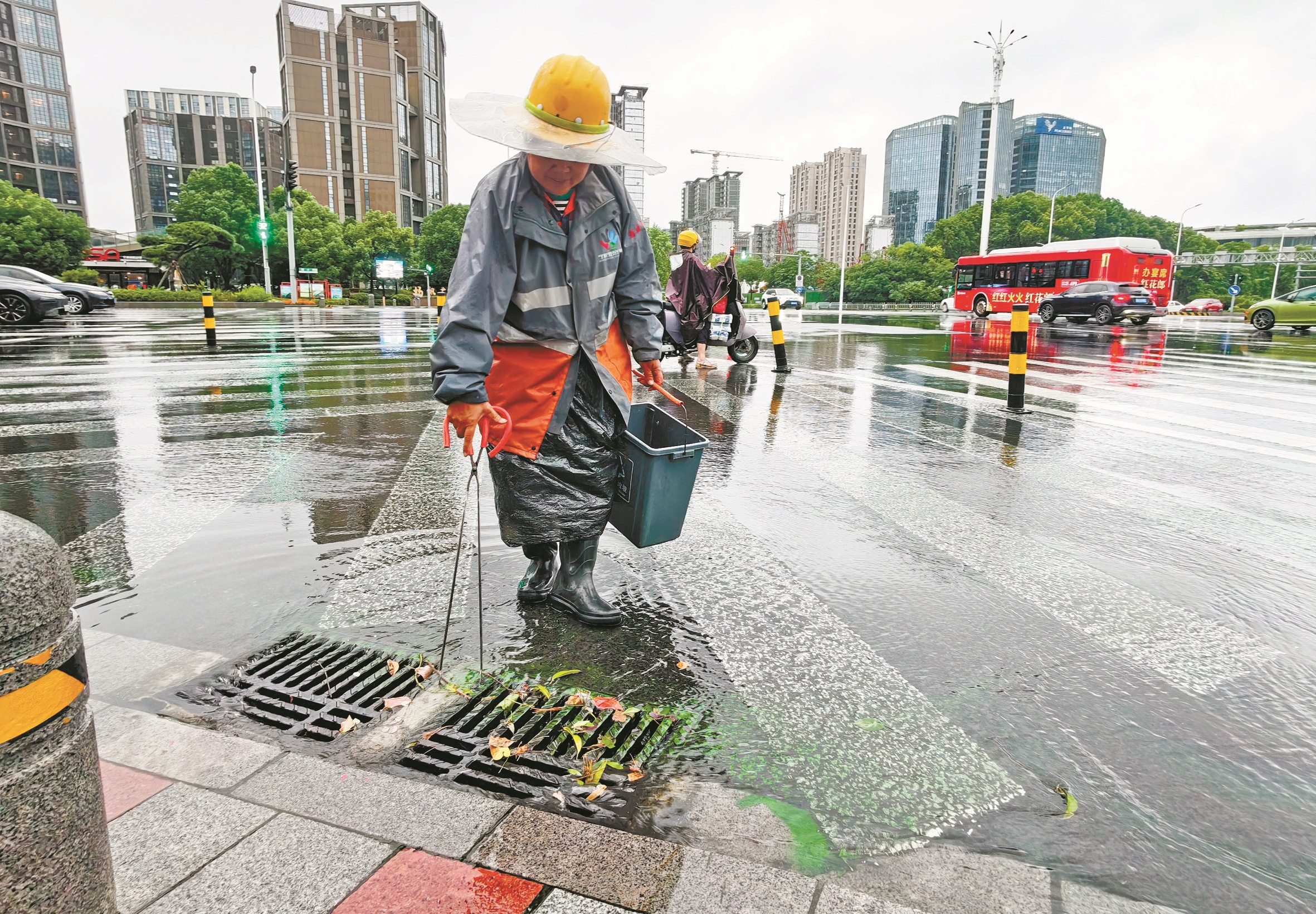 昨日下午,受对流云团影响,甬城局部大暴雨,在院士路上,环卫工人清理排水口,以免堵塞排水管道。