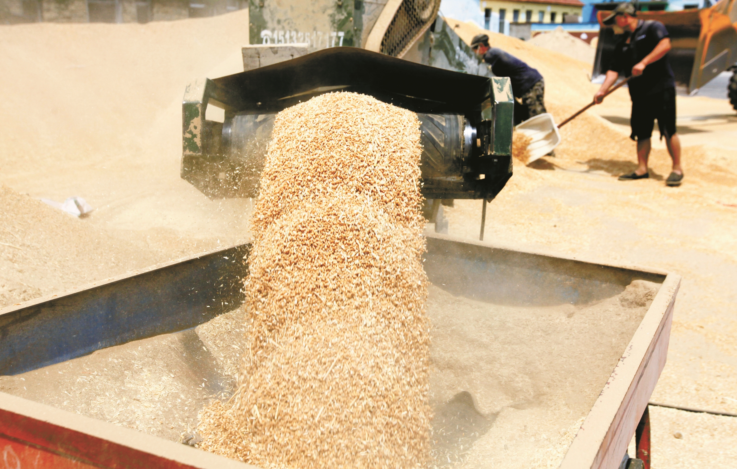 6月14日,在山东省临沂市平邑县一粮食收储企业,传输线向仓库运送夏粮。全国夏粮小麦收购工作开局良好,截至6月13日已累计收购夏粮小麦超1700万吨,进展顺利。(新华社发)