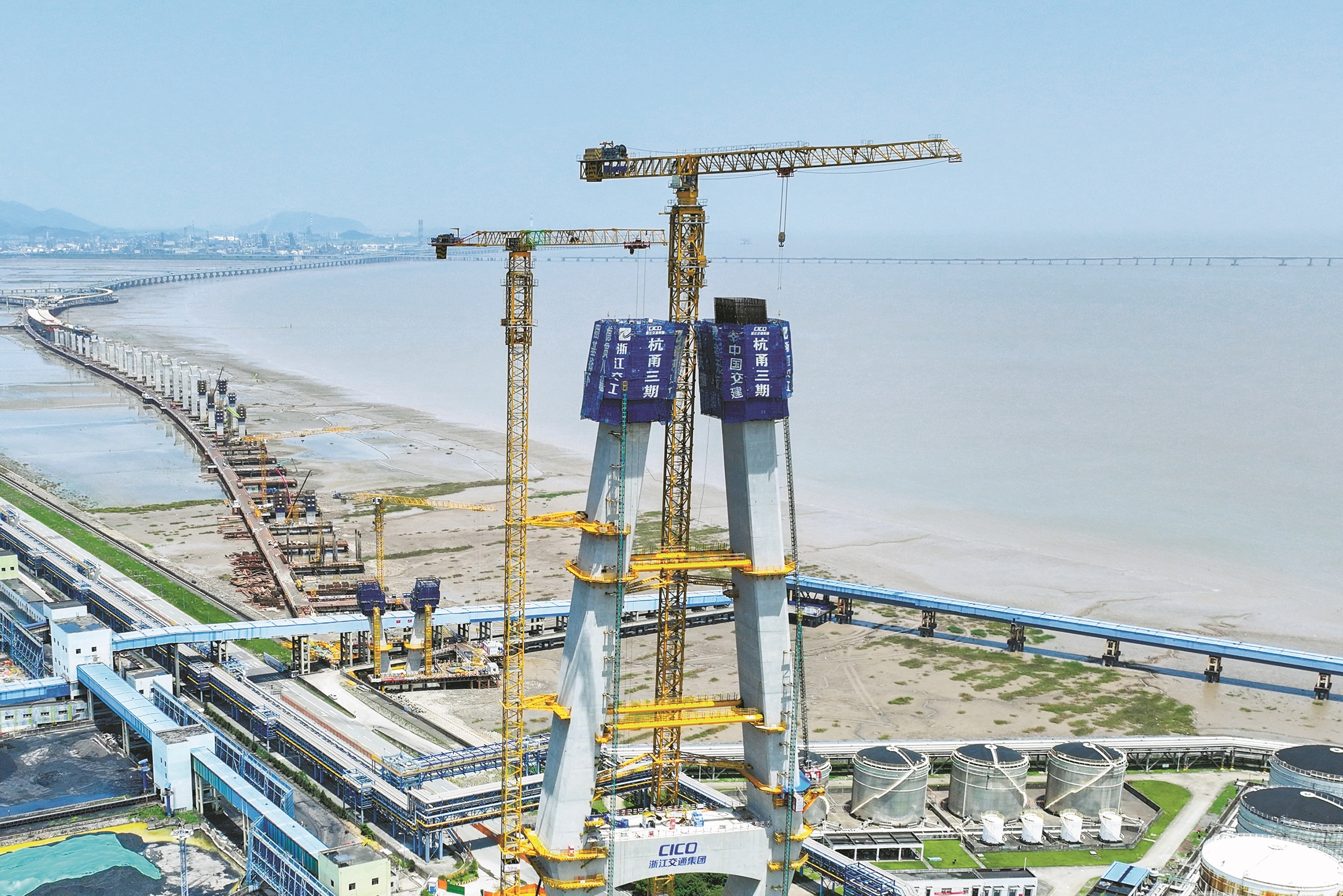 目前,大桥主塔累计完成79个节段,相当于完成3幢50层楼高的建筑,目前还剩39个节段。按照既定工期,3座主塔将在今年9月、10月先后完成封顶。甬江特大桥的钢梁架设工作将在今年7月开工,朝着2026年大桥合龙目标稳步迈进。