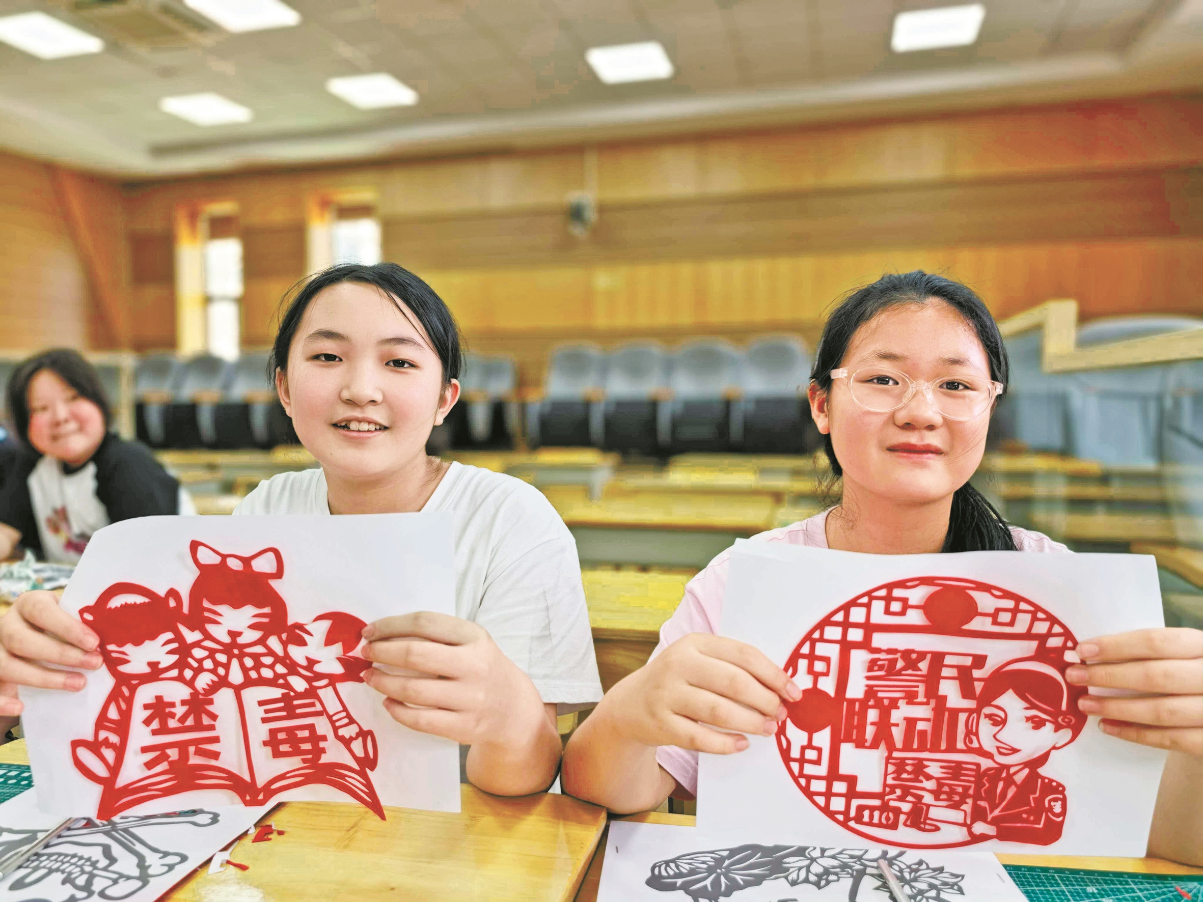 活动现场,志愿者引导孩子们发挥创意,将“远离毒品”“珍爱生命”等标语转化为镂空剪纸作品。同时,社区网格员以通俗语言解读禁毒法、未成年人保护法,通过案例引导学生树立法治意识。
