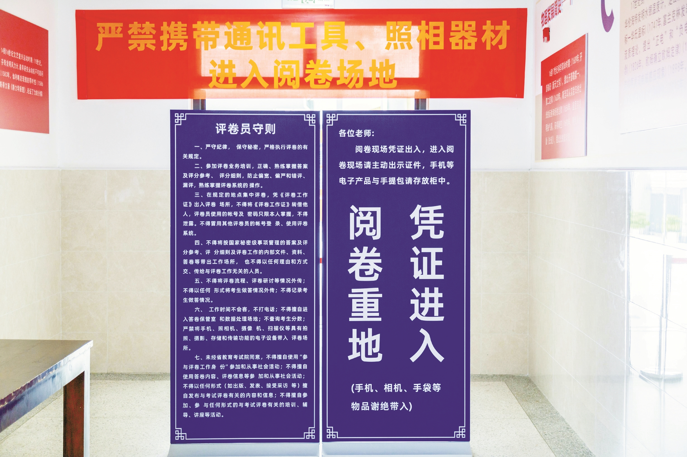 记者在现场看到,评卷点实行封闭式管理。场馆外围拉起警戒线,入口处智能安检门与工作人员双重值守。评卷教师凭专用证件进入,手机等电子设备一律不得带入,随身物品统一存放。每名教师均签署安全保密承诺书。