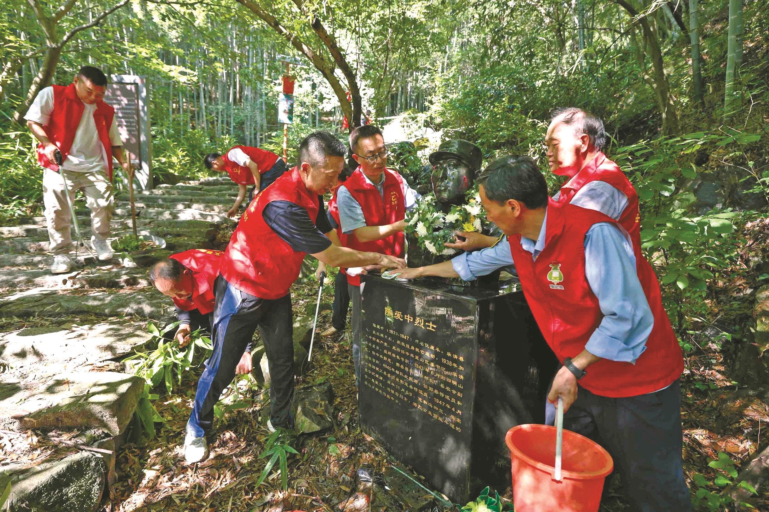 昨日,海曙阳光公益团队联合宁波公交集团第四分公司、宁波市中北汽车客运有限公司、宁波正吉工程管理咨询有限公司等成员单位的党组织,前往海曙区横街镇惠民村的红色古道,开展缅怀先烈和环保公益活动。40余名志愿者认真清洗沿途的革命烈士雕像,并对红色古道进行了全面清理。(陈结生 徐琳 摄)