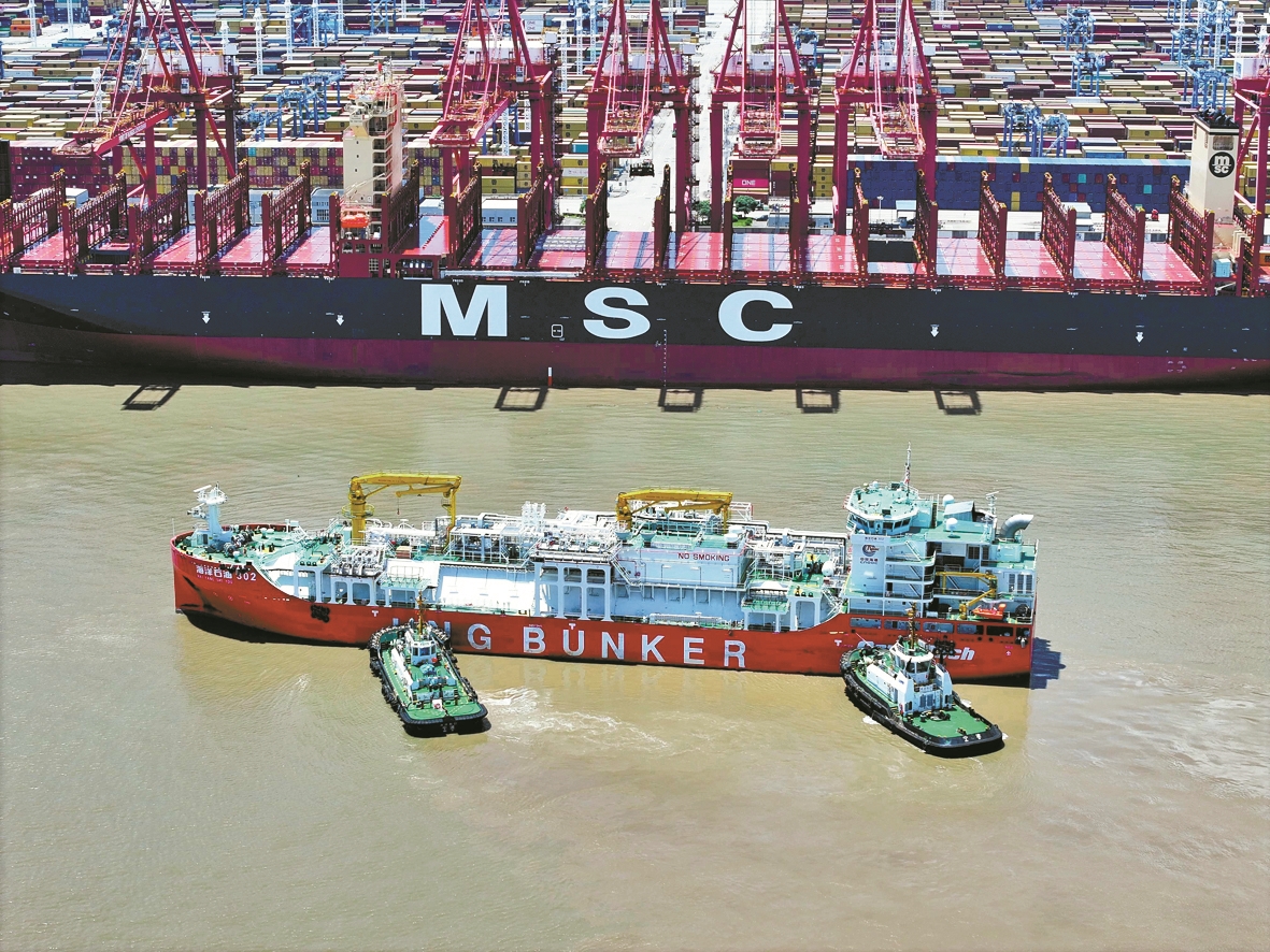 6月30日,LNG加注船“海洋石油302”轮缓缓靠向集装箱船“地中海阿莱西亚”轮。(吴梦凯 摄)