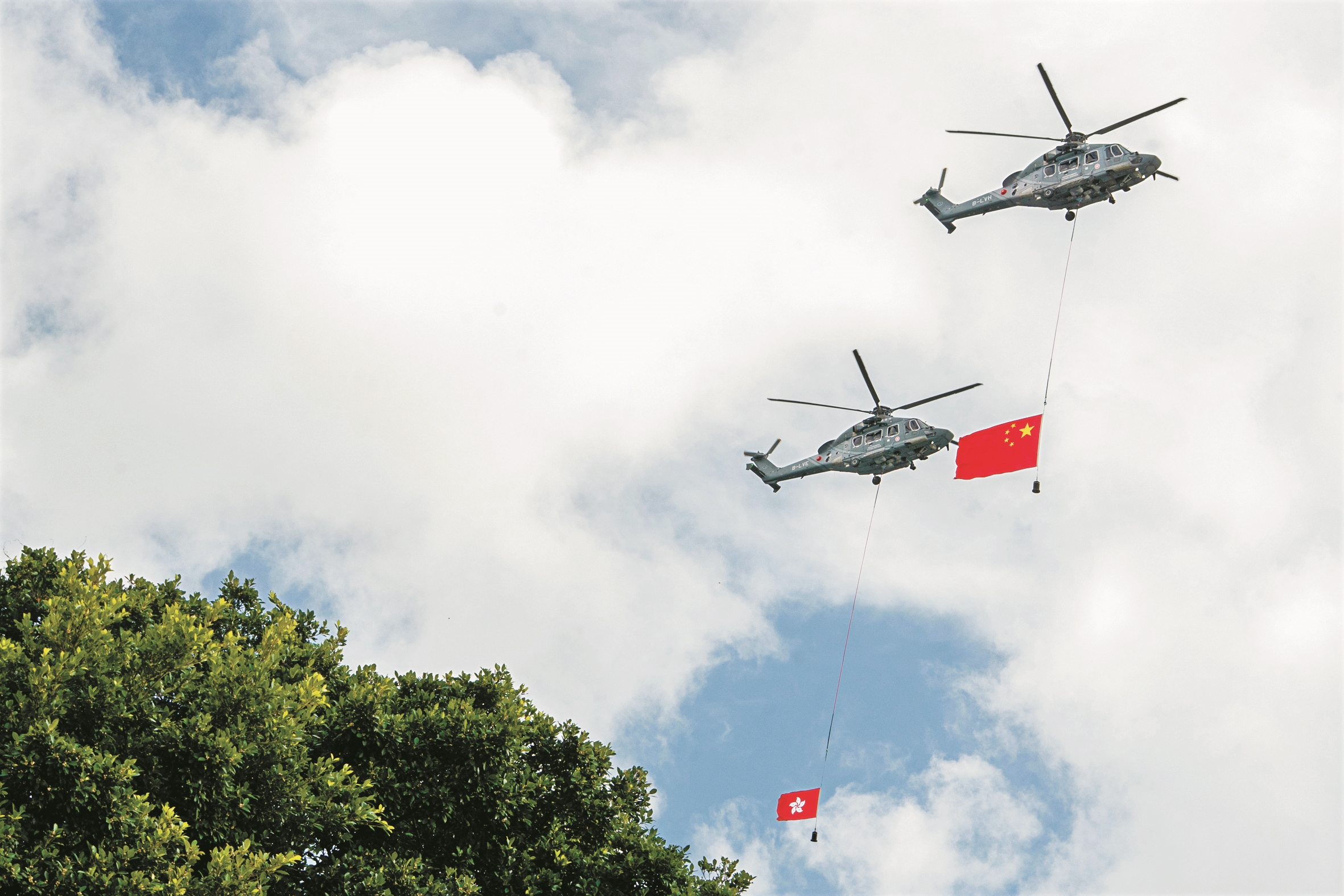 7月1日,香港特区政府在金紫荆广场举行升旗仪式,庆祝香港回归祖国28周年。这是分别悬挂中华人民共和国国旗、香港特区区旗的直升机从空中飞过。