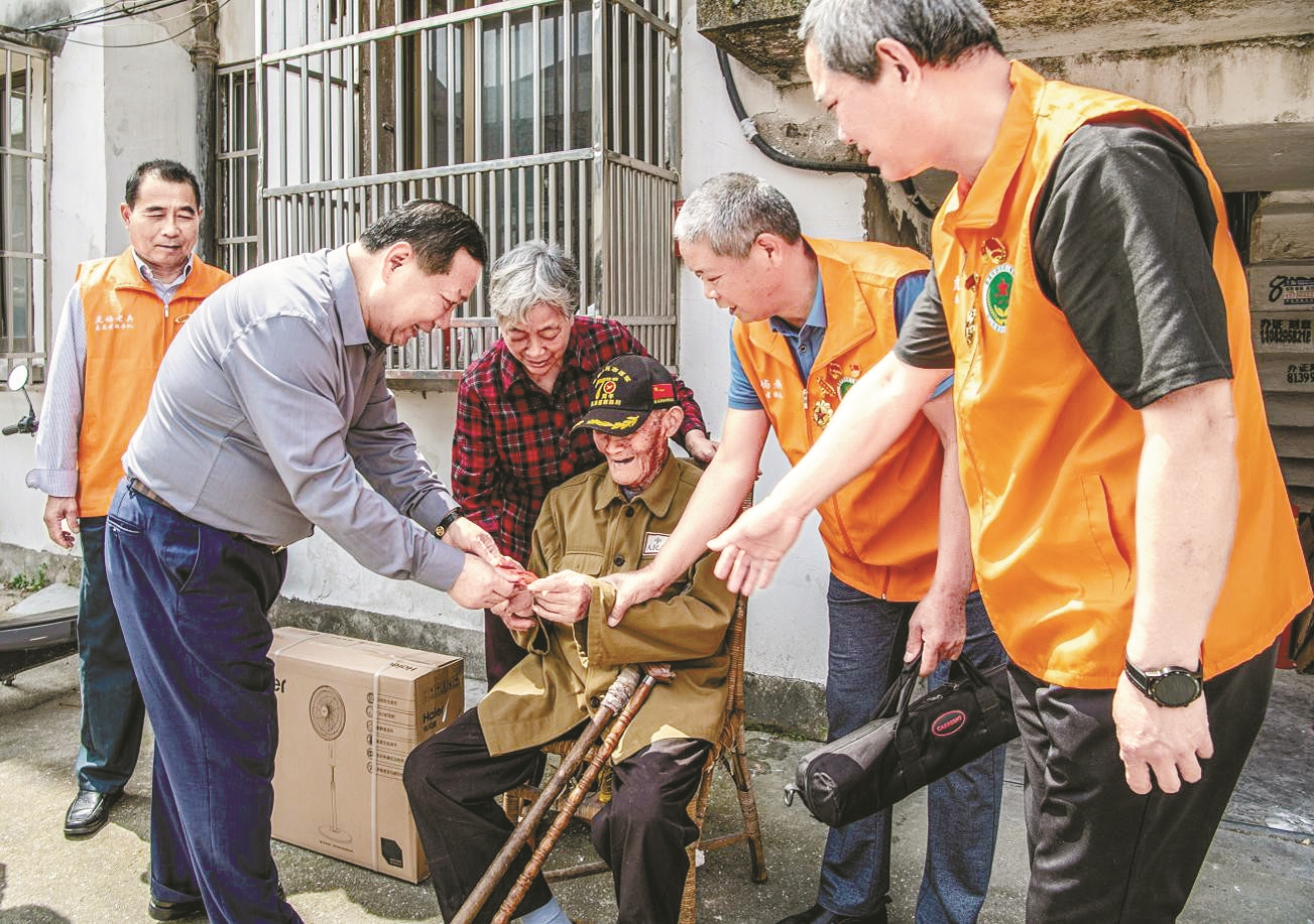 去年“八一”建军节前夕,曹建波带领老兵志愿者赴桥头镇毛三斢村,看望慰问68年党龄、年届九旬的抗战老兵毛建庆。看着毛老墙面斑驳、屋顶漏水、雨棚和木门均已破损,严重影响视线通透的老屋,曹建波当即与“虎屿老兵”志愿服务队负责人联系,共同为毛老修缮老屋,助力其安享晚年。