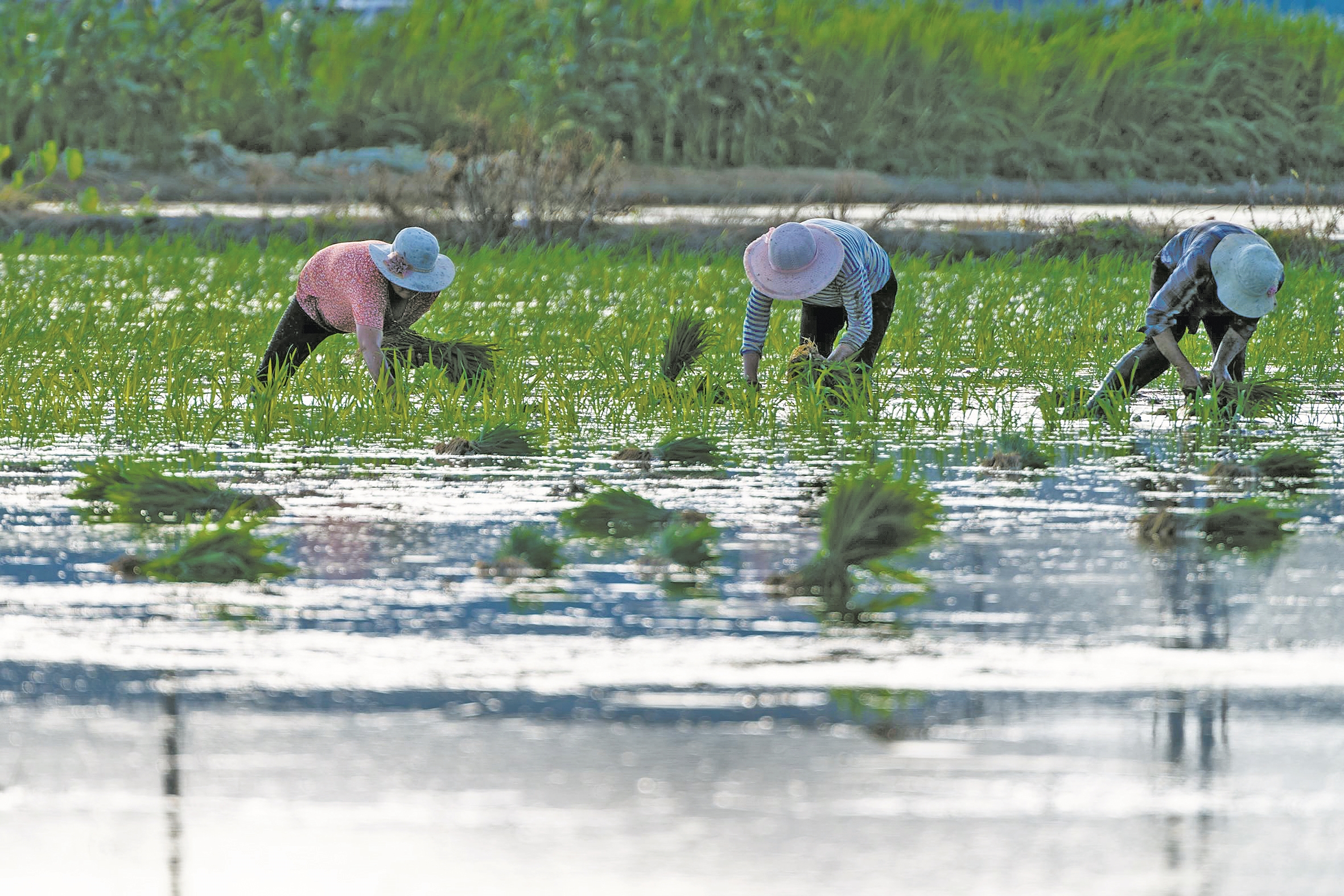 连日来,海曙区古林镇蜃蛟村的蔺草收割还未结束,农户就已忙着同步翻耕田地,插秧种植晚稻。在古林镇,每年6月底至7月初,人们都会在收割后的蔺草田里插种晚稻;10月下旬至11月上旬,晚稻成熟收割后,开始新一季的蔺草种植,循环往复,形成当地独具特色的“蔺草—水稻轮作系统”。据了解,此轮作系统能使种植蔺草后得到改善的土壤更好地用于种植水稻,不仅蕴含了自然农法思想和生态价值理念,而且充分体现了古人的聪明才智与创造能力。(徐能 忻之承 摄)