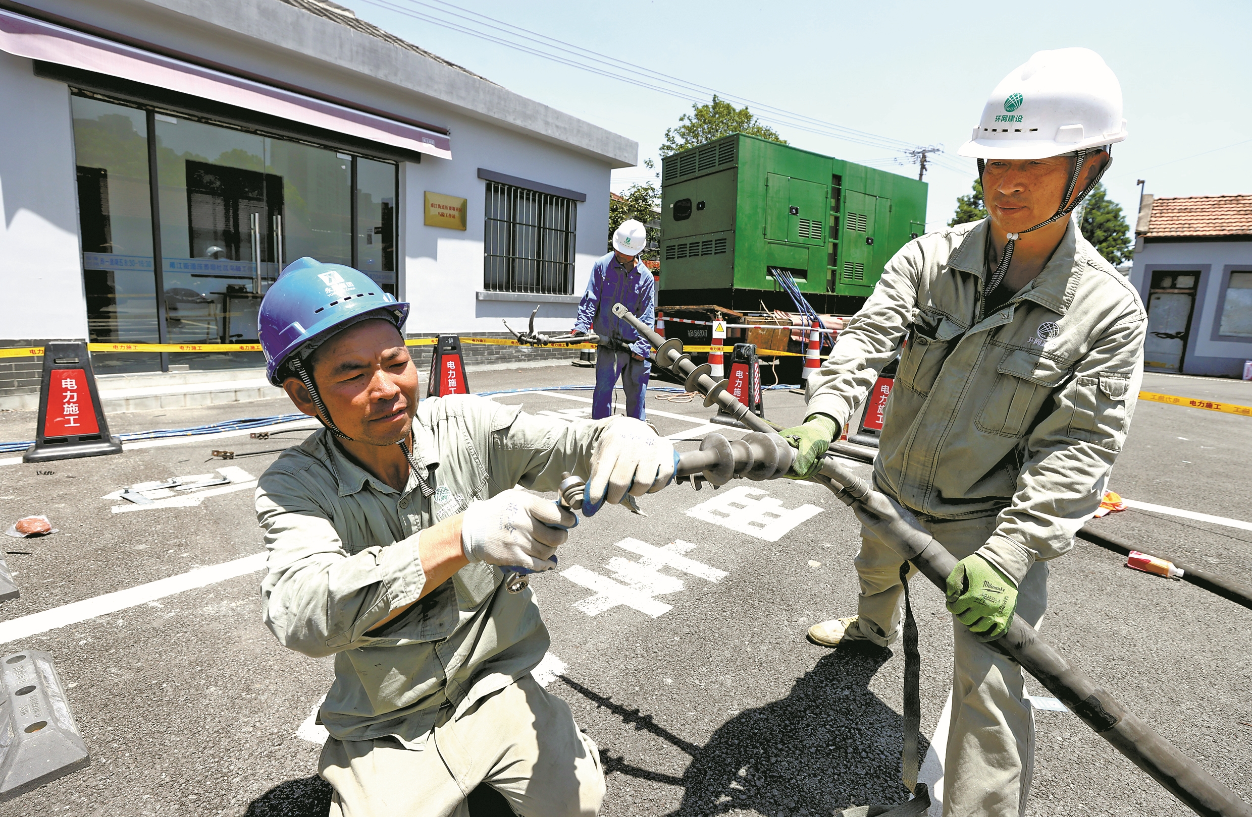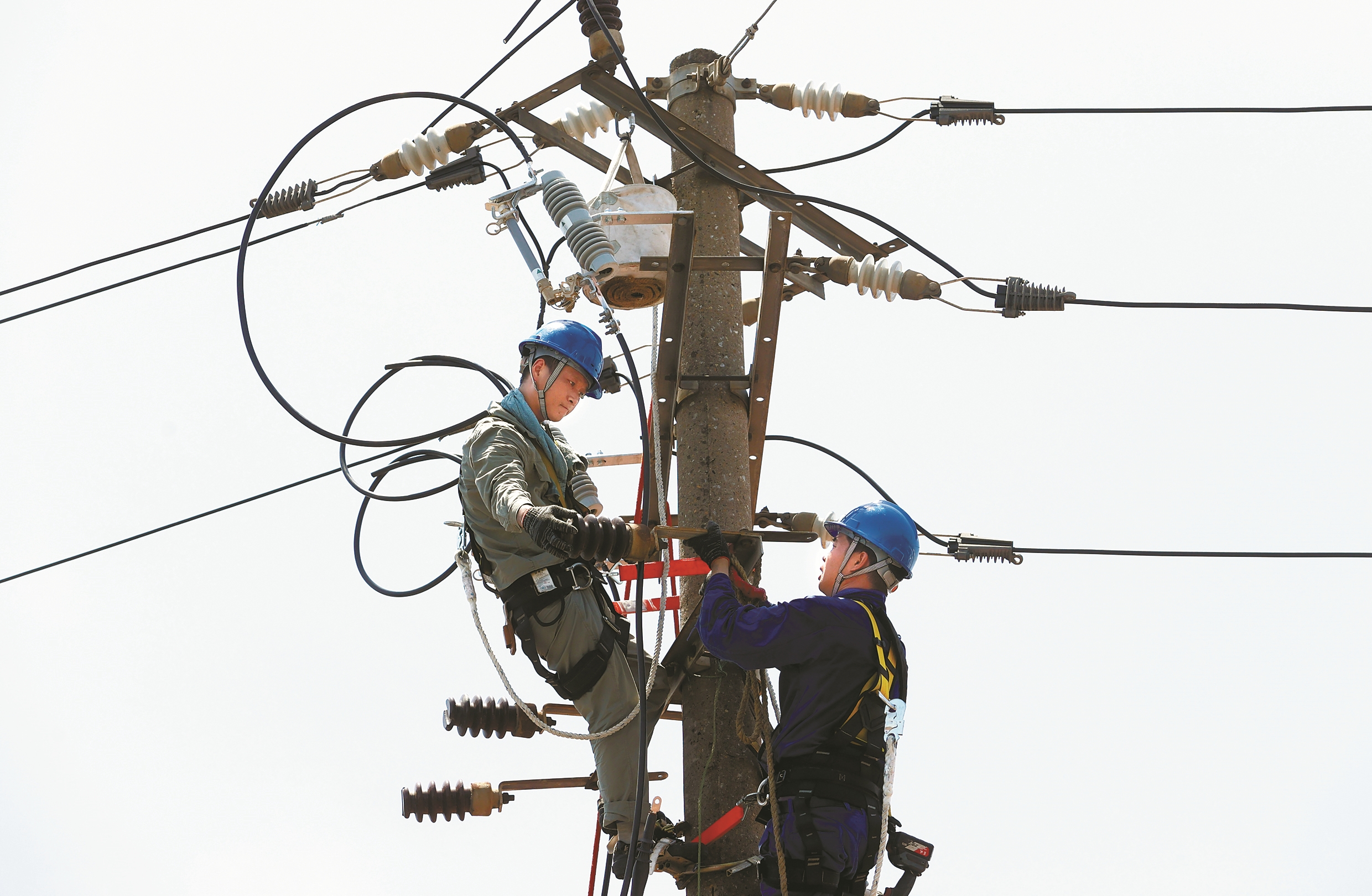 昨天,在江北区甬江街道乌隘村的施工现场,国网宁波供电公司20余名配网作业人员顶着高温开展10千伏邬隘线综合检修工作,进一步提升配电线路防雷击和智能化水平,有效保障迎峰度夏期间当地可靠用电。(王幕宾 朱启东 摄)