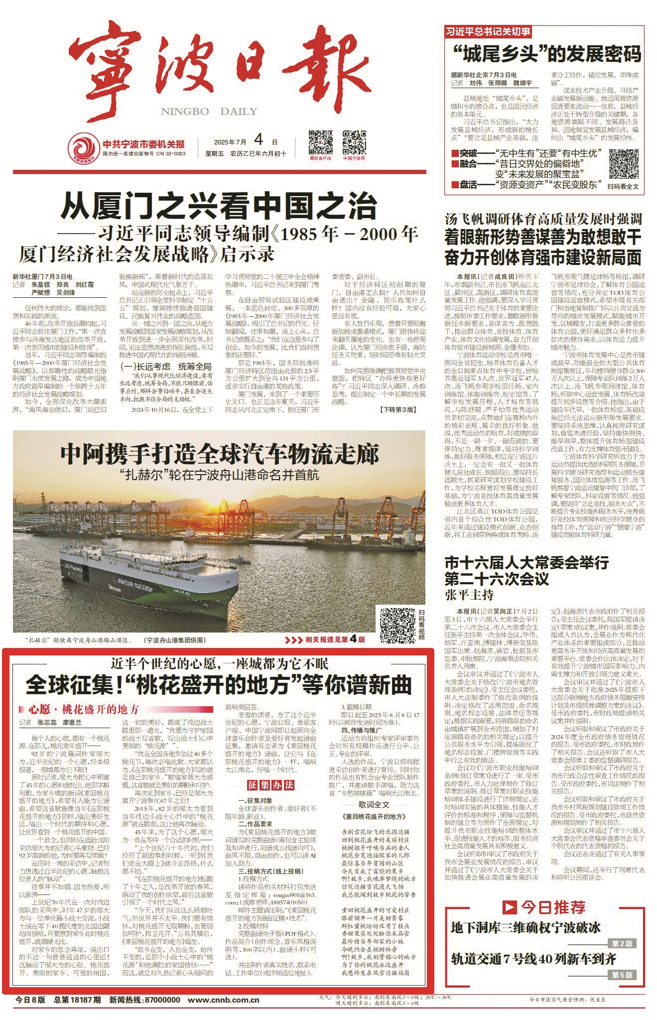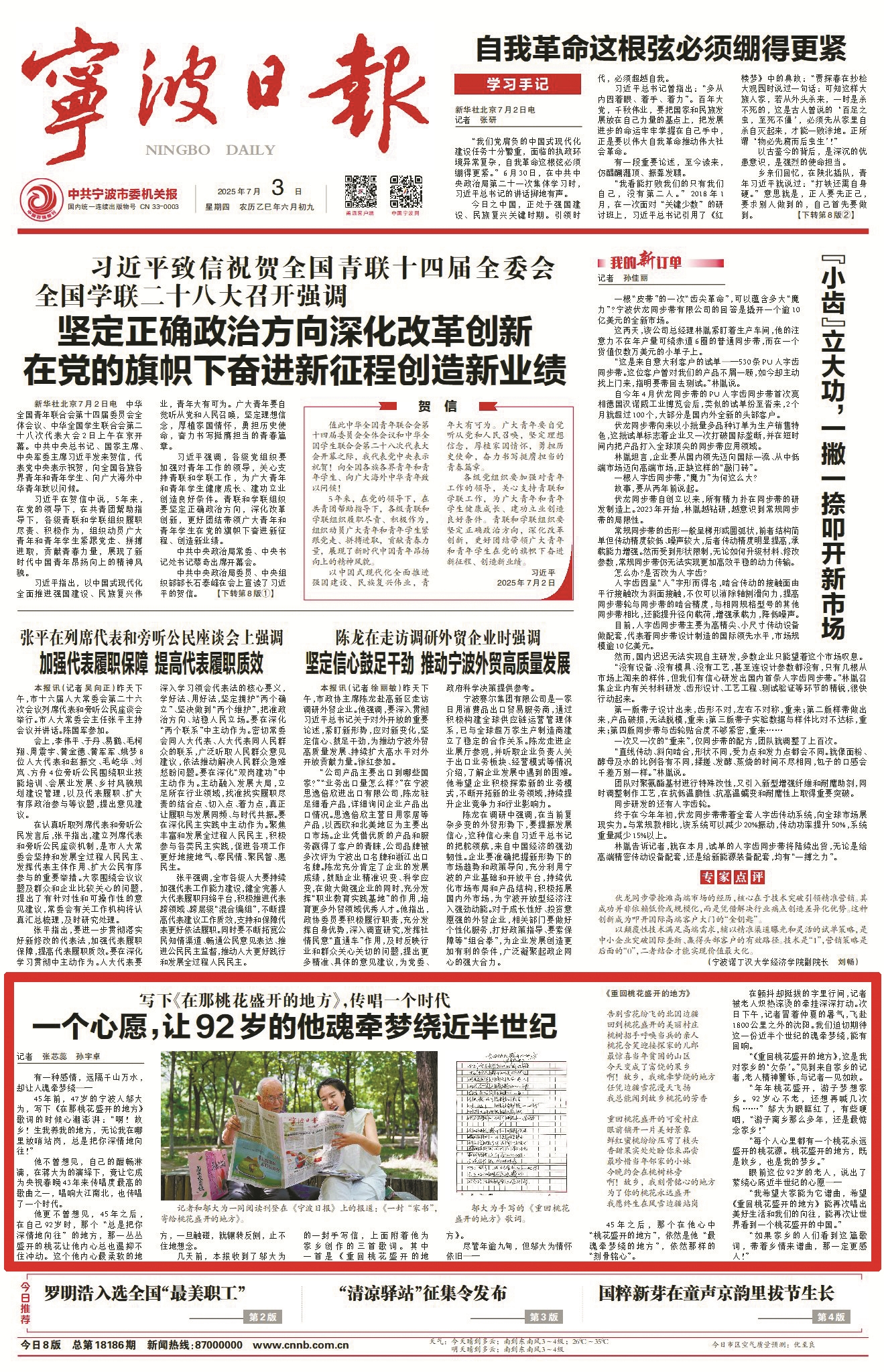 前昨两日,本报在头版重磅报道邬大为对家乡的真挚心愿。这位92岁的宁波籍词作家写下的《在那桃花盛开的地方》曾传唱一个时代。前不久,他字斟句酌,为家乡创作歌词《重回桃花盛开的地方》,“希望有人为它谱曲,让它像当年《在那桃花盛开的地方》一样,唱出一个时代的期待和心愿,让世界看到一个桃花盛开的中国”,情真意切,感人肺腑。