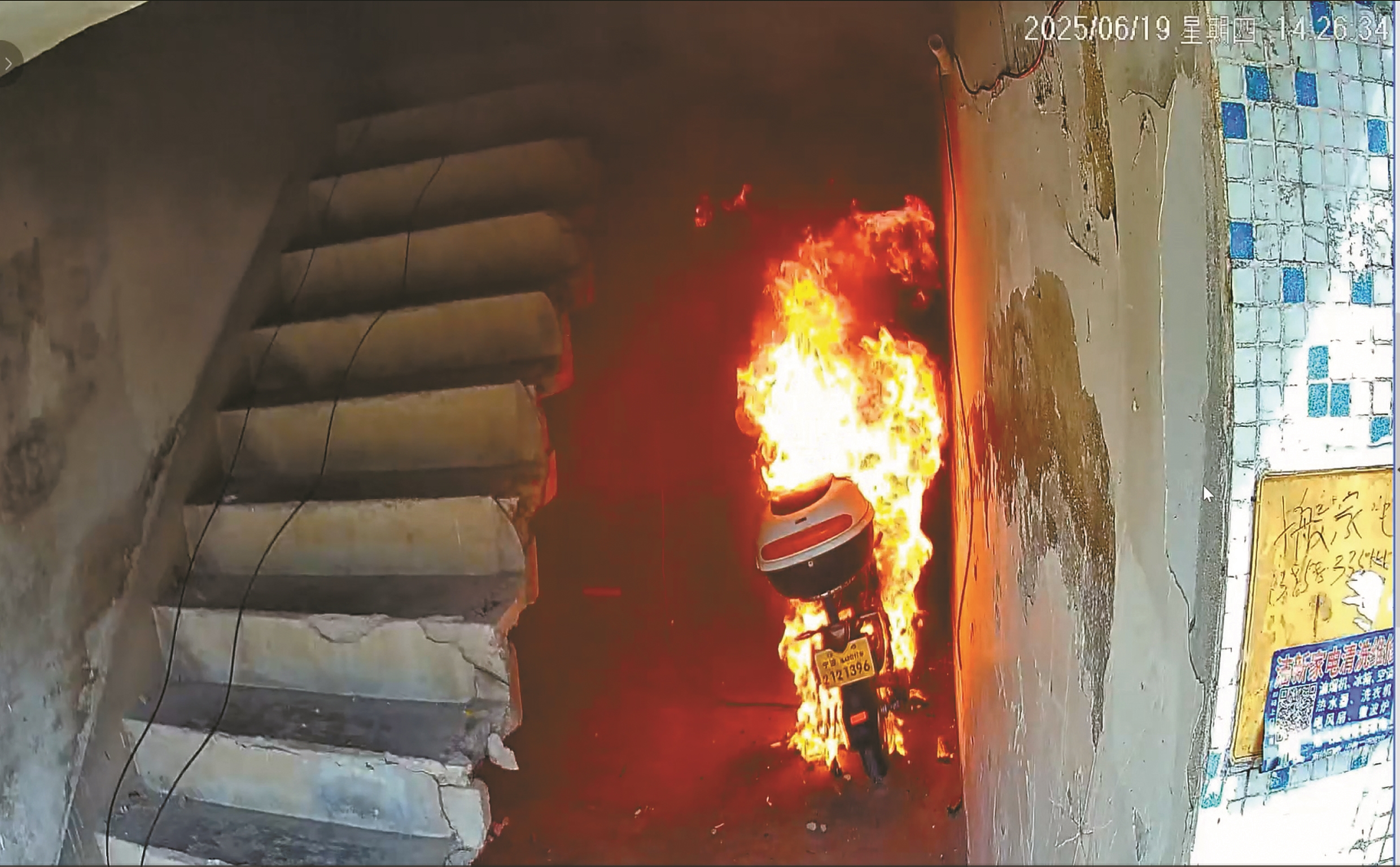 本次实验选在两栋老式居民楼,一层为车棚储藏室,二层至五层为住宅。实验开始后,消防员分别将新旧国标电动自行车置于楼道口,并通过触发装置点燃。