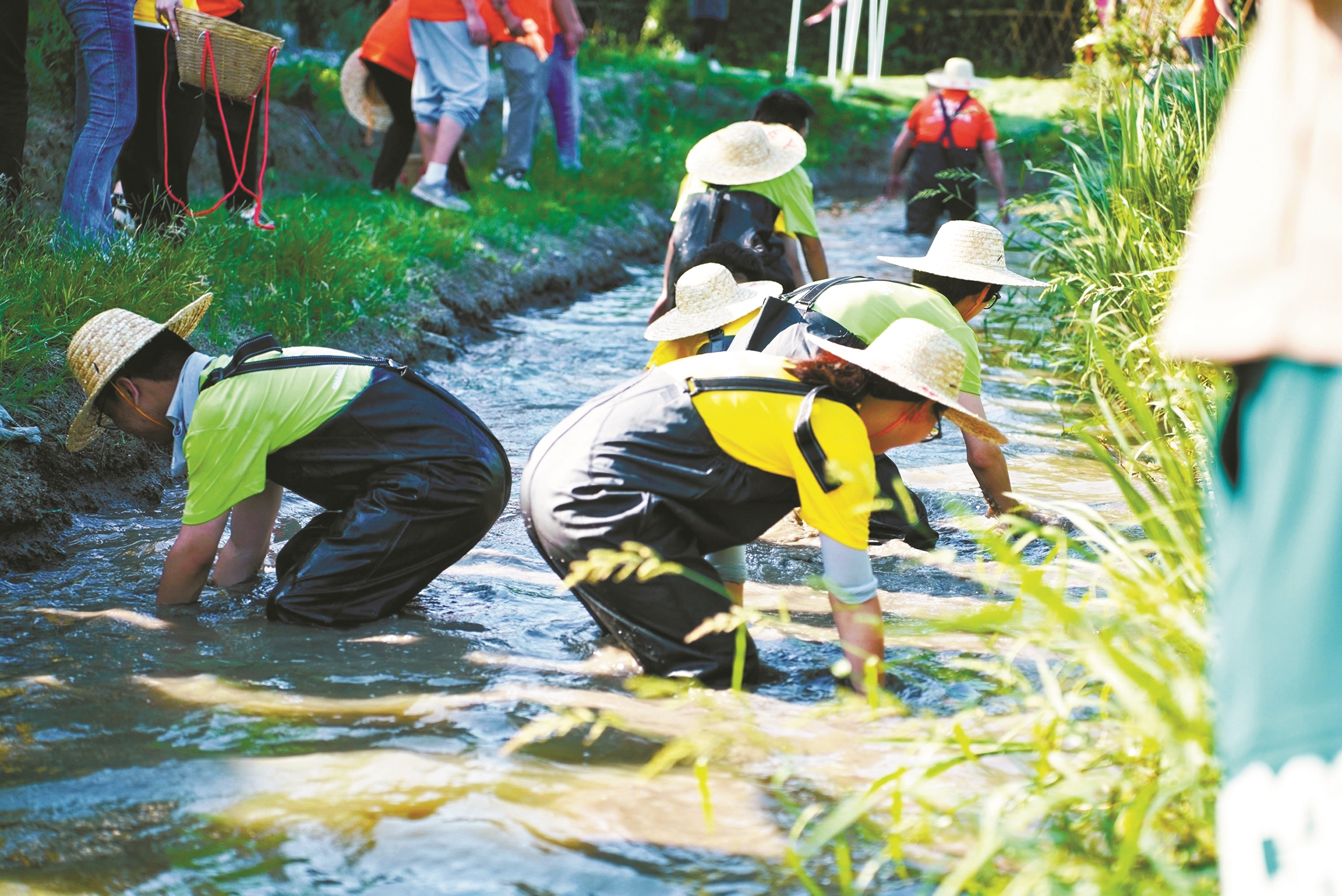 在“鱼你共富”浑水摸鱼赛里,参与者赤脚涉水,在地里“寻宝”,体验别样的乐趣;“青春接力”插秧赛场上,选手与村民协作,在水田里插秧……