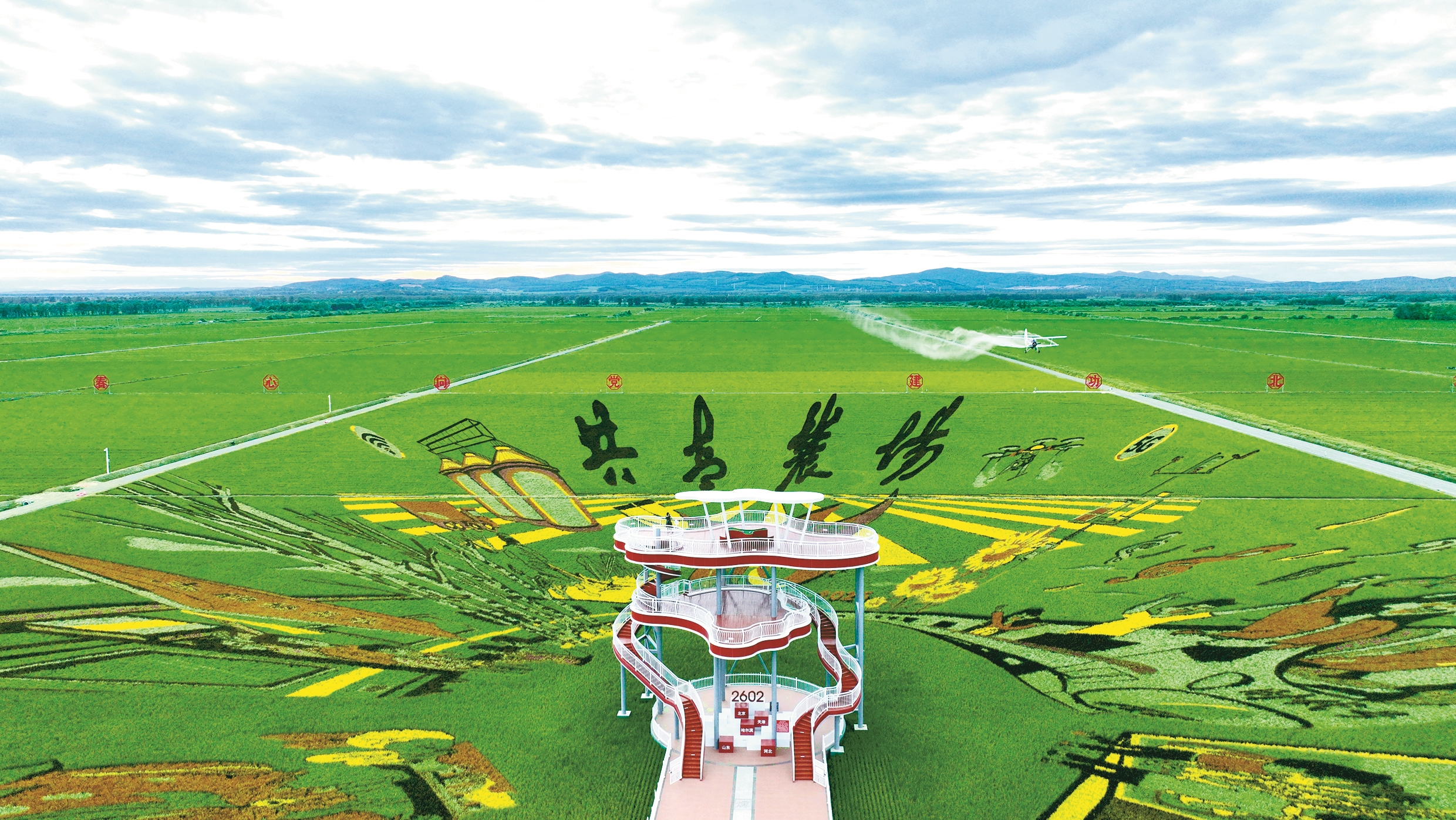 7月3日,在北大荒集团黑龙江共青农场有限公司河北庄管理区“禾作空间”水稻科技示范园,农用飞机在稻田画上空进行航化作业(无人机照片)。