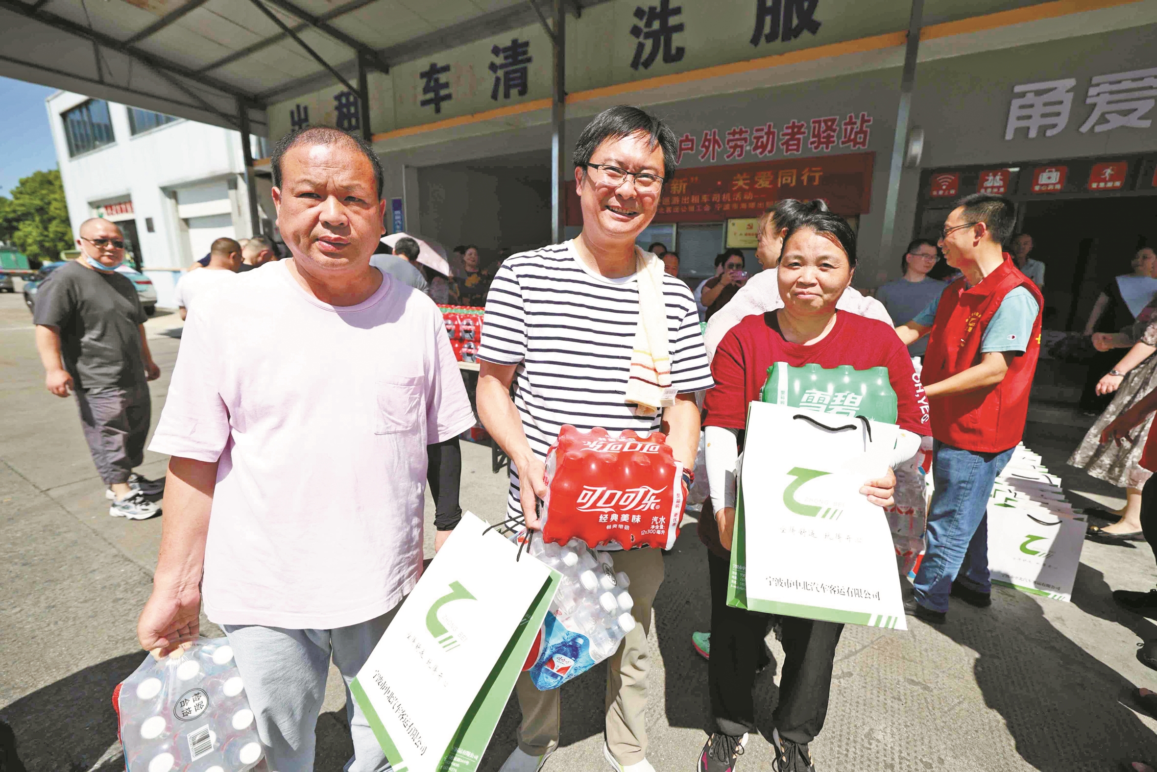 7月4日中午,在宁波市中北汽车客运有限公司甬爱E家休息网点,古林镇总工会、宁波市中北汽车客运有限公司工会、海曙出租车服务中心等单位举行了关爱送清凉活动,向300多名出租车司机发放矿泉水、饮料、毛巾、风油精等清凉物品。
