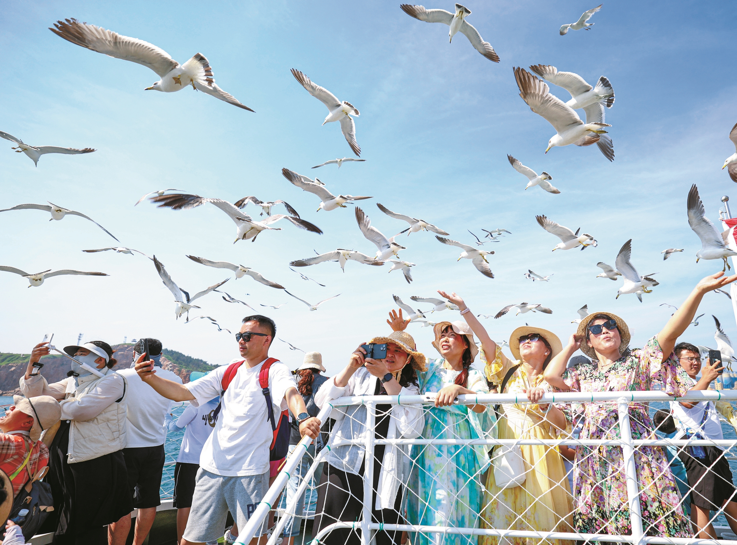7月5日,在山东省荣成市海驴岛海域的一艘游船上,游客与黑尾鸥互动。