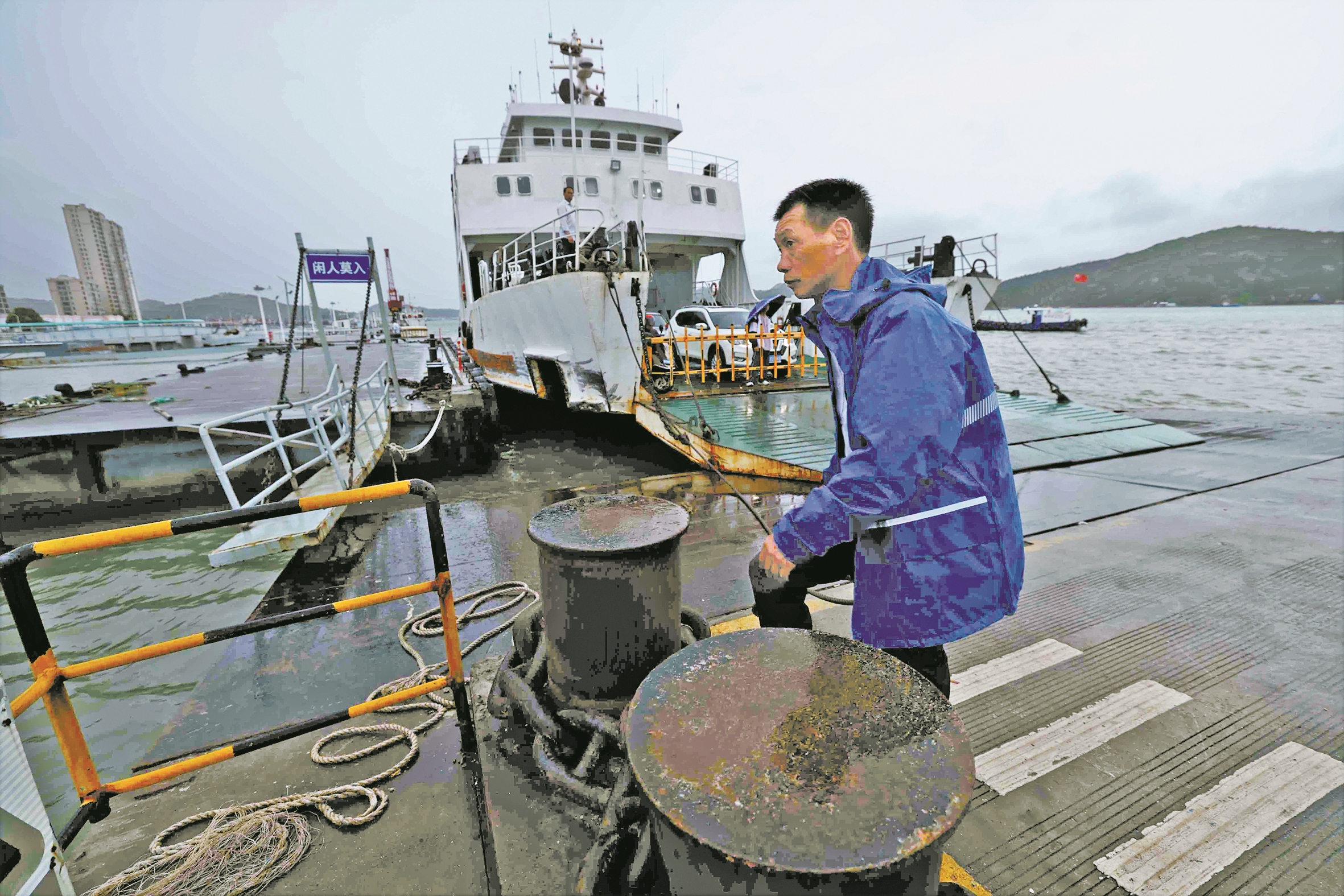 昨日18时,记者来到石鹤汽渡码头看到,随着汽笛长鸣,最后一班从鹤浦开往石浦的汽渡轮安全靠岸,乘客与车辆有序离开码头,海事部门工作人员在现场开展巡查。