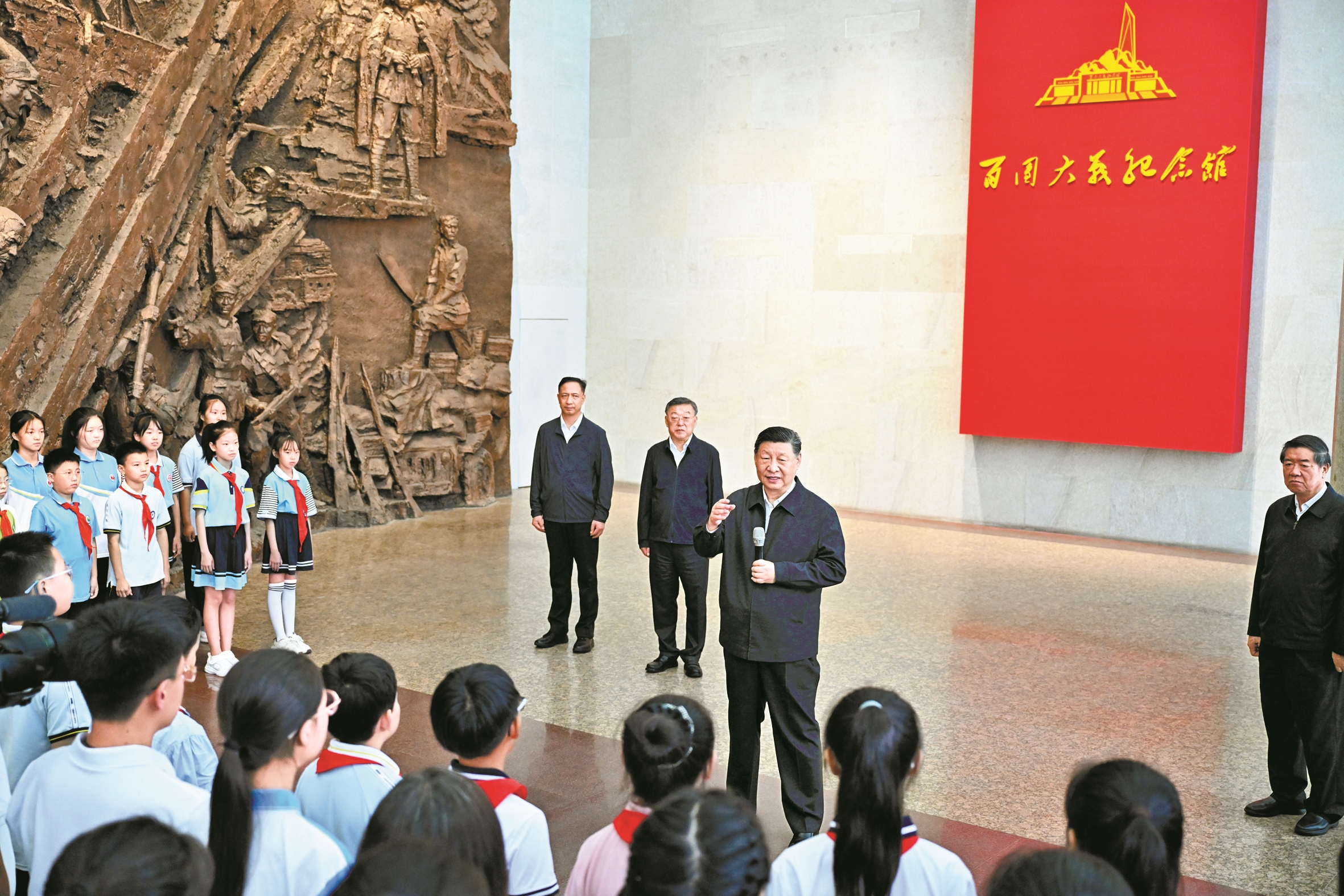 7月7日至8日,中共中央总书记、国家主席、中央军委主席习近平在山西考察。这是7日下午,习近平在位于阳泉市狮脑山的百团大战纪念馆考察时,同前来参观的青少年学生和纪念馆工作人员亲切交流。 (新华社记者 殷博古 摄)