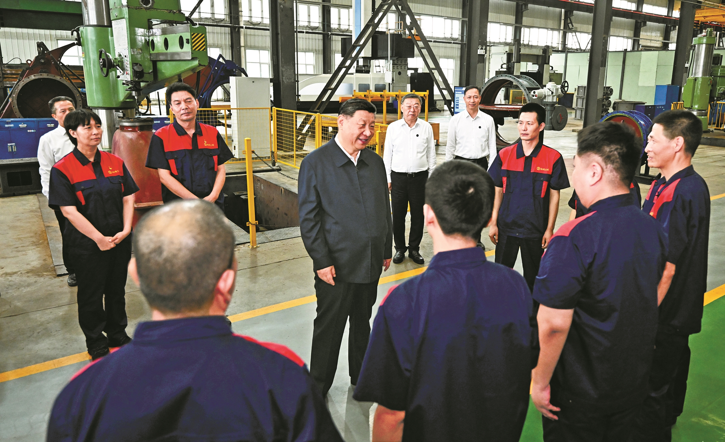 7月7日至8日,中共中央总书记、国家主席、中央军委主席习近平在山西考察。这是7日下午,习近平在阳泉阀门股份有限公司考察时,同企业员工亲切交流。 (新华社记者 燕雁 摄)
