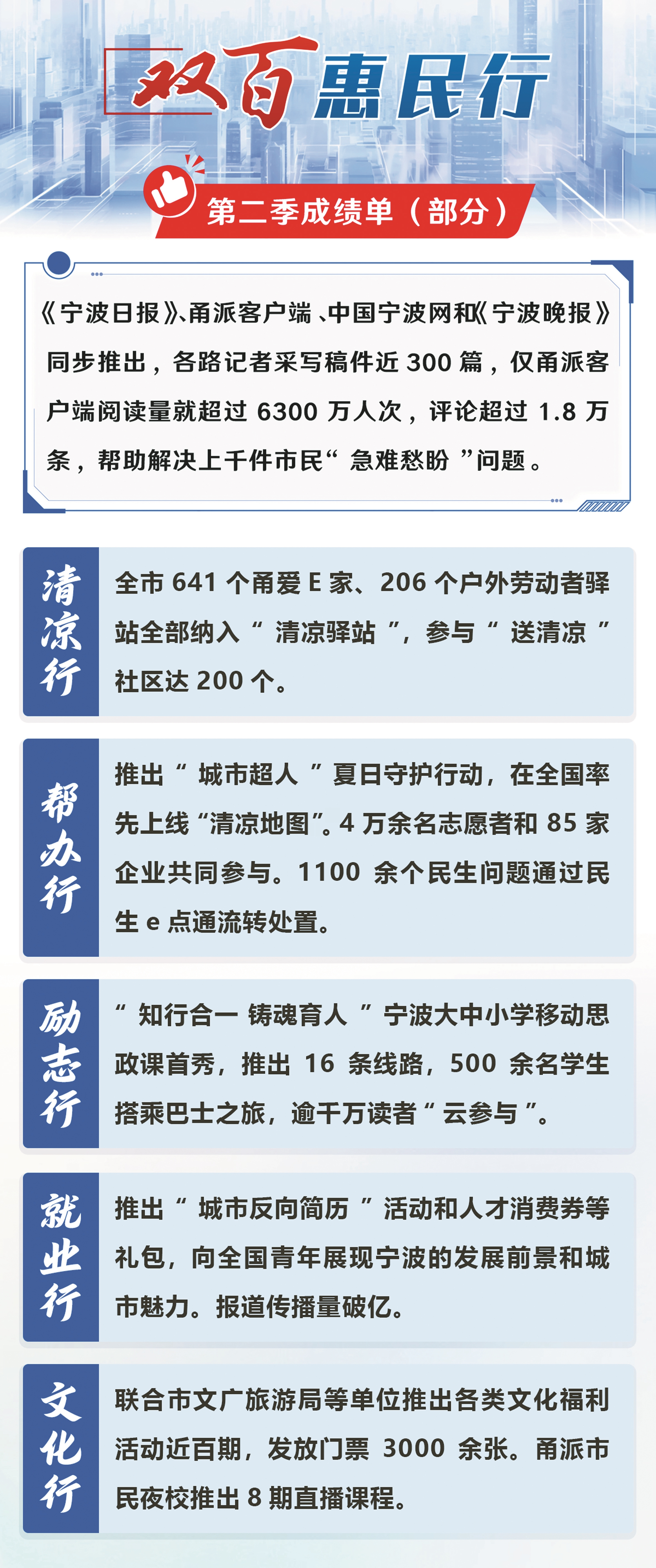 百姓点题,部门跟进,记者助力,是“‘双百’惠民行”的运行机制。在去年第二季行动中,百名记者冒酷暑、顶风雨,围绕清凉行、帮办行、励志行等十大子项,采写了近300篇报道;与各部门和单位紧密联动,解决群众“急难愁盼”千余件,仅甬派客户端总阅读量就超过6300万人次,评论超1.8万条。这些“十行”实践,不仅解决了众多民生“关键小事”,更编织出一张覆盖全城的“幸福网”。