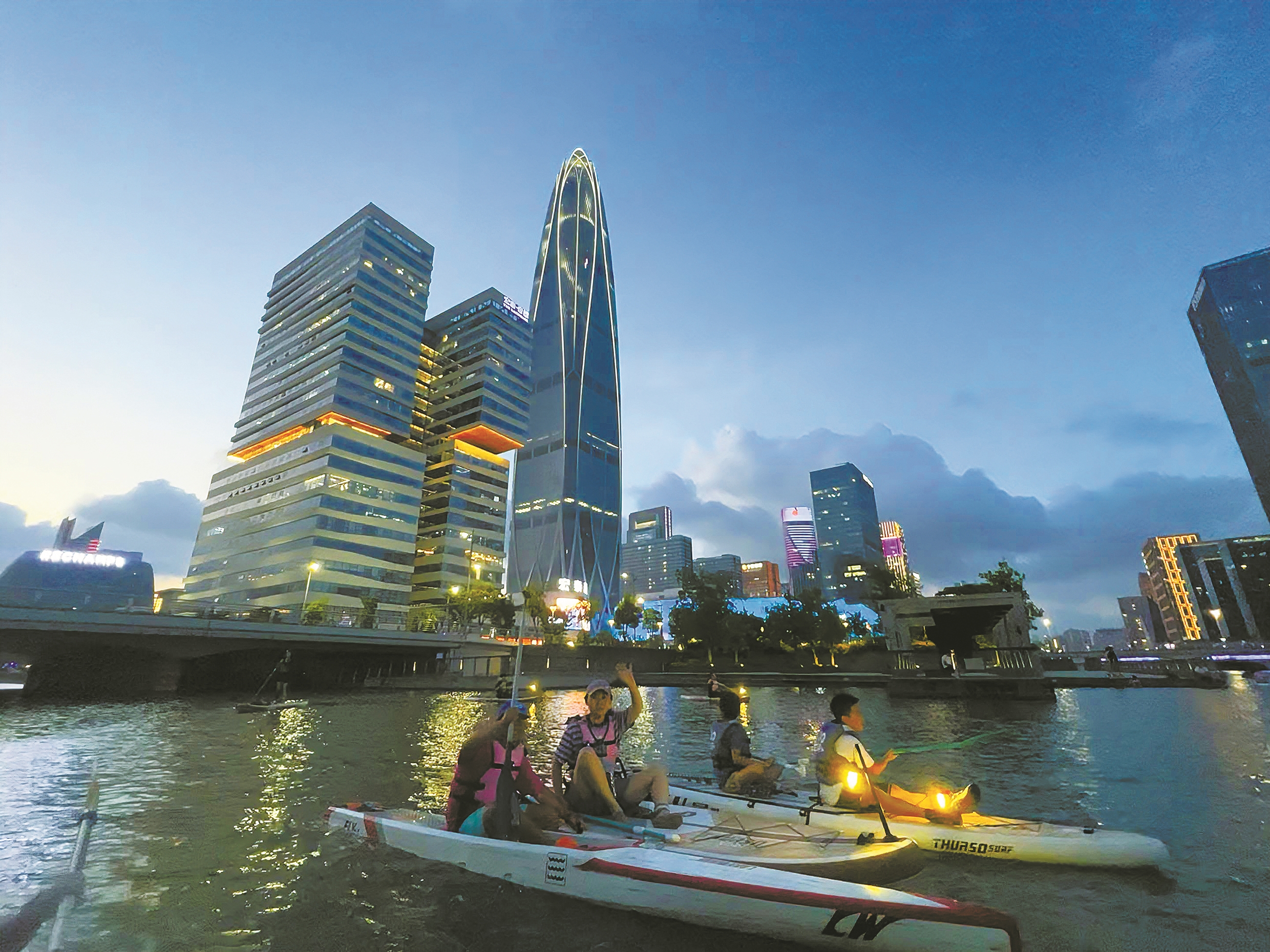 夏日里,宁波水上运动再掀热潮。文化广场中轴线水域的“桨板热”格外治愈——没有冲浪的刺激,只有桨板划水的轻响和伴着晚风等待日落的松弛。图为昨日傍晚,市民在划动桨板,共享城市“蓝调时刻”。(记者 陈妤涵 摄)