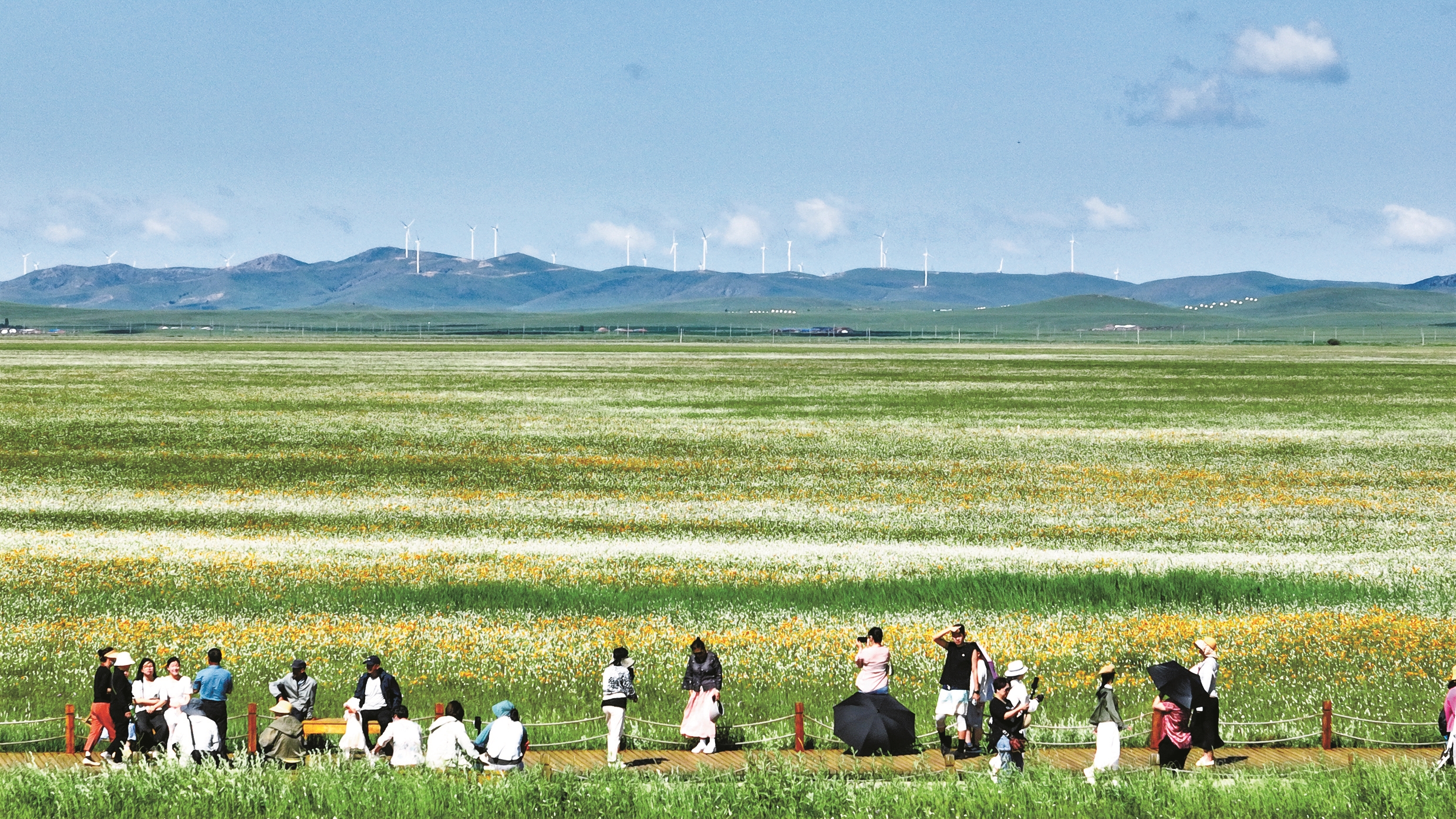 盛夏时节,内蒙古锡林郭勒盟正蓝旗金莲川草原迎来最佳观赏期,金黄色的花海与苍茫草原相映成趣,世界文化遗产元上都遗址的断壁残垣在草原上清晰可见。游人流连花丛中或驻足遗址前,感受自然野趣与历史文化。