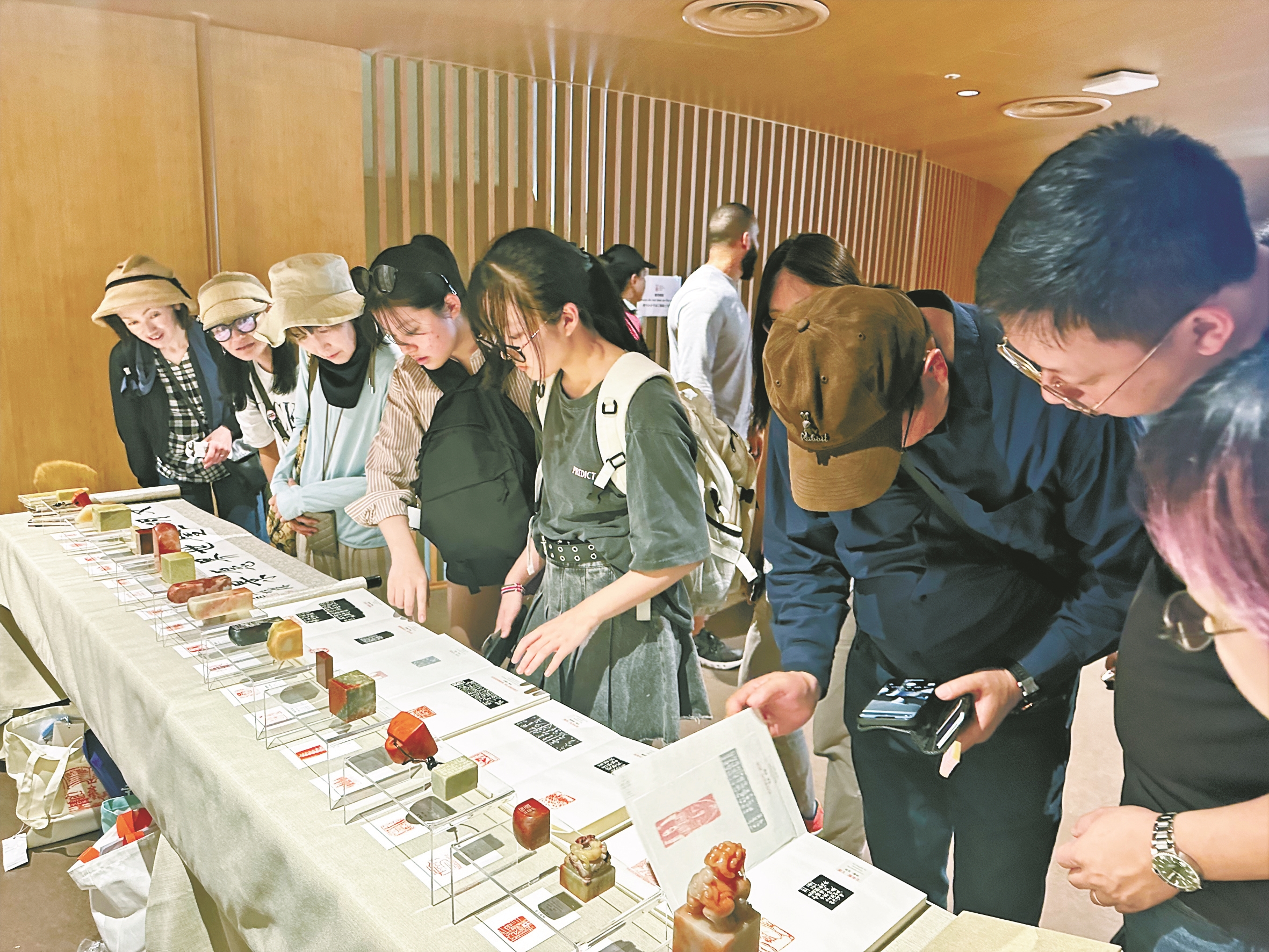 展览现场,一枚枚印章甫一亮相,便吸引了众多国际友人的目光。不少观众驻足仔细欣赏,纷纷赞叹其独特创意。主办方精心准备的带有图形印元素的印章本、扇子、书签等深受喜爱。