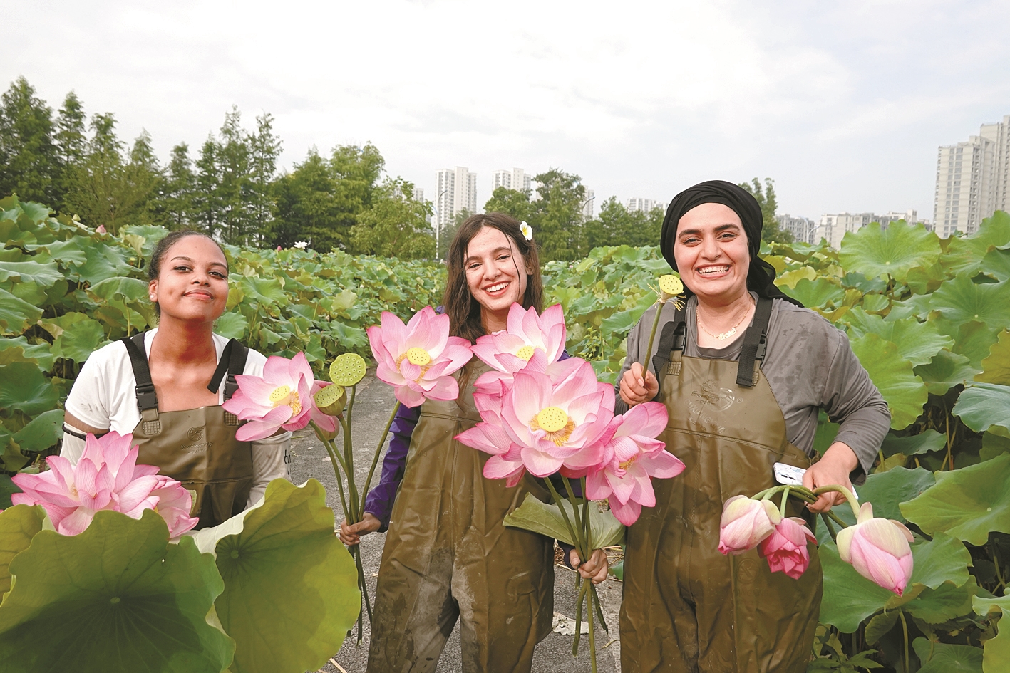 International students take part in harvesting lotus flowers and seed pods straight from the pond. [Photo by Ying Zhanglei]