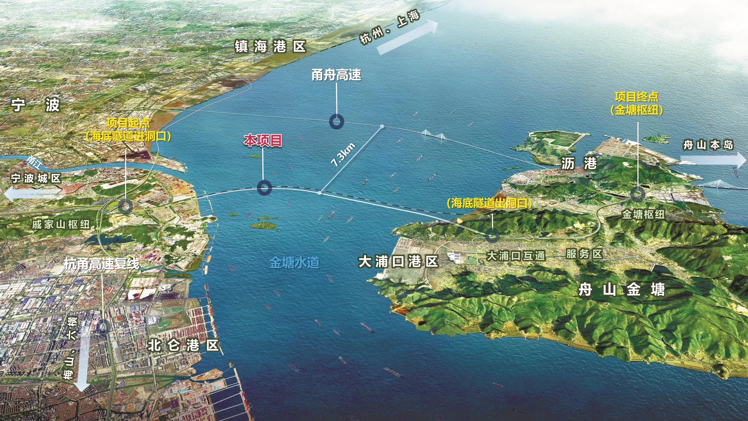 甬舟高速复线二期项目是甬舟高速复线的重要组成部分,项目起点顺接甬舟高速复线好思房至戚家山段工程,向东设置海底隧道下穿金塘水道,与在建甬舟铁路隧道共廊带平行布置,至舟山金塘岛大浦口登陆。项目由浙江交通集团主导投资建设,总投资约156亿元,全长约18公里。项目的关键工程为全长11.6公里的金塘海底隧道,是目前世界最长的海底双向六车道高速公路隧道,同时也是世界最长的海底公路盾构隧道,具有超长盾构双向掘进、超大盾构直径、超高水压、超浅覆土始发、超近接穿越、超复杂地质条件、超精准海底地中对接、超长通风距离等特点,技术难度达到世界级水平。