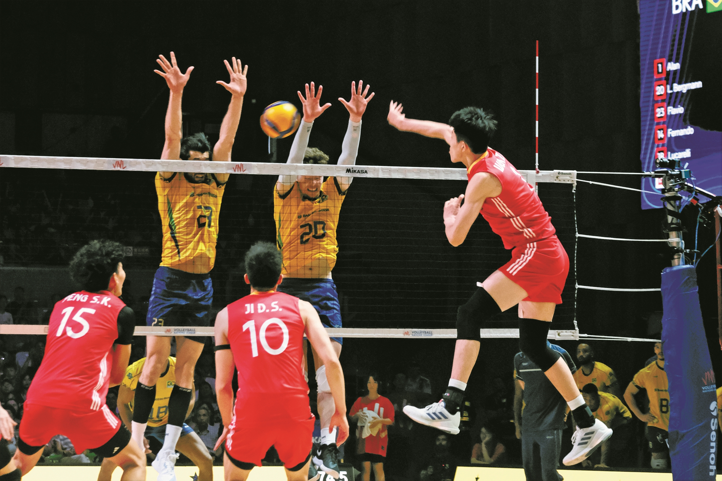 开场后,中国男排发球手感不佳,巴西男排抓住机会连续得分,随后中国男排利用对手失误成功反超。凭借更出色的拦网效率和防守韧性,中国男排一度将对手逼入暂停,但巴西男排连拦带扣紧追不舍。